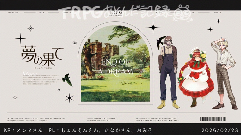 おみそTRPG☆quiet followMEMOCoC「夢の果て」KPメンヌさん、PLじょんそんさん、たなかさん、おみそきれいででっかいのはパスのあとに!ヒント:無断転載および生成AIの学習に利用しないことに同意しますか はい/いいえ show hide show all(+1 images) Tap to full screen (size:800x450).Repost is prohibited Let's send reactions! freqpopularsnackothersPayment processing Replies from the creator Follow creator you care about!☆quiet follow おみそTRPGDONE君姫虫めづるきれいででっかいのはパスのあとに!ヒント:無断転載および生成AIの学習(複製)へ利用しないことに同意しますか はい/いいえ 2 おみそTRPGDONE神子島潔きれいででっかいのはパスのあとに!ヒント:無断転載および生成AIの学習(複製)へ利用しないことに同意しますか はい/いいえ 4 おみそTRPGMEMOCoCシナリオ「七不思議ホラーRTA」きれいででっかいのはパスのあとに!ヒント:無断転載および生成AIの学習(複製)へ利用しないことに同意しますか はい/いいえ 2 おみそTRPGDONE煉獄原朱雀きれいででっかいのはパスのあとに!ヒント:無断転載および生成AIの学習(複製)へ利用しないことに同意しますか はい/いいえ 13 おみそTRPGMEMOCoCシナリオ「マカーオーンは戦場で臆さない」きれいででっかいのはパスのあとに!ヒント:無断転載および生成AIの学習(複製)へ利用しないことに同意しますか はい/いいえ 3 おみそTRPGMEMOCoCシナリオ「匿名幸福論者は獨と踊る」きれいででっかいのはパスのあとに!ヒント:無断転載および生成AIの学習に利用しないことに同意しますか はい/いいえ 2 recommended works もちたPAST載せ忘れてたマギカロギアTRPGの立ち絵傘の構造はよく分かりませんでした。 2 佐久間 和泉DOODLE好きな曲を描くアレ 2 水晴-MinaSe-DONEセッション絵友情出演というかGMがやりたかったということでうちの忍者大集合してきた!全部新規絵で行きたかったが画力が仕事しなかったので過去絵調整&新規絵( ˇωˇ ) 4 china_tukiCAN’T MAKEキャンディレインに連れていく予定なんかぱっとしないのなんでだろう、、、 ま ゅSPOILERとっても良かった♡ネタバレ注意 11 柚木@trpgDONEリリリバ!刑事シナリオでした!HO4を握りました!えへへ(*´▽`*)ディスプレイ+顔差分 4 izusan_trpgMOURNING⚠『VOID』現行未通過は閲覧❌がっつりネタバレだから注意チャーリーさんに殴られたんで描きました 14 miwotsumuSPOILERふわふわクリームさらにジューシー 立ち絵 さかもとDONE【輾転と町は】日向 照道(ひゅうが てるみち)/パフォーマー 2
