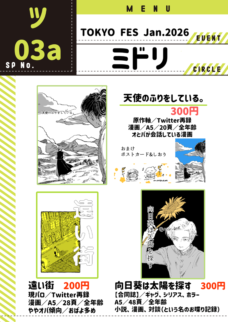 むー氏☆こそフォロお品書き2026年1月25日 TOKYO FESお品書きです。新刊は全てTwitter再録です。既刊はひれなんさんとの合同誌です。 タップで全画面(原寸:2893x4093)無断転載禁止 リアクションをたくさん送って応援しよう! よく使う人気おやつその他支払処理中 作者からのリプライ 気になる人をどんどんフォローしよう!☆こそフォロ むー氏お知らせ2026.01.25発行遠い街 200円現パロ/Twitter再録漫画/A5/28頁/全年齢ややオバ傾向/おばよ多め 20 むー氏お品書き2026年1月25日 TOKYO FESお品書きです。新刊は全てTwitter再録です。既刊はひれなんさんとの合同誌です。 むー氏らくがきぎゅん⭐︎ヨさん むー氏過去のを晒す2025年春コミ発行同人誌の再録です。お手に取って頂き、ありがとうございました。内容は現パロです。いつも通りフワッと描いたものです。感想貰えると嬉しいです年末のアニメでオバに沼り、辛抱たまらなくなり勢いで春コミに申し込み、自分史上最速で同人誌を作るという個人記録を更新したものです。あの時の春コミ新規オバの方々は私と同じでアニメから辛抱たまらなくなって申し込んだサークルさん達だったと思っています。 40 むー氏らくがき今描いている漫画の冒頭。雪が降っています。 むー氏らくがきあきら放送記念自分の初見の実録です。 3 おすすめ作品 ふくいできたシュミットの私服 はるおりできたシュミ誕2まいめ たるひゃできた2024.05.03 シュミット・ファンデルハウゼン・フォン・シューマッハさんお誕生日おめでとうございます。年々幼くなってる気がする… 2 toneらくがき2枚目ネタバレです。 2 yahari自主練🌏️オク バデ ヨハマりたて…🤤皆可愛いね… 16 不知火(しらぬい)らくがきポンデヘアのヨレンタさんですヨレンタさんに色んなおしゃれを楽しんで欲しい😭 むー氏らくがきシュミさん難しいね 蛙翁🐸できた久々にポイポイ!先行公開!!※🌎。×gntmドゥラカちゃんにチャイナコスしてもらった!!差分は両作知ってる人は泣くはず…!!😭 2 minilop_nguyenらくがきChougiYuuki - condidamdang của anh TrẩuAre u 18? - yes/noArt by Tải