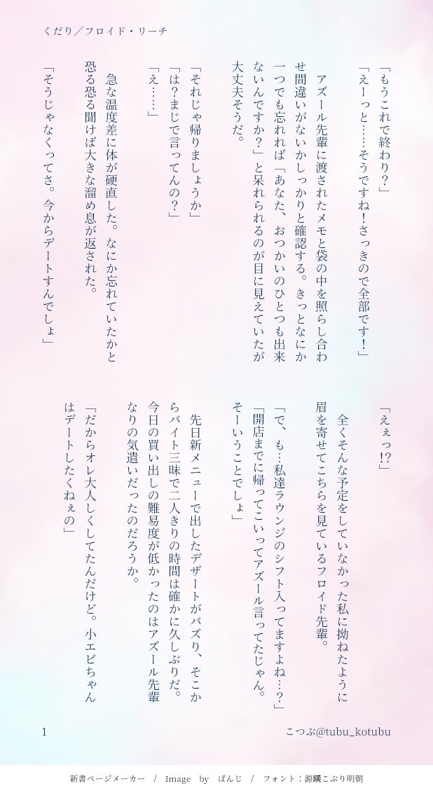 tubu_kotubu☆quiet followDONEwebイベント『魔法学校と××番目の猫』Twitter既出作品展示『くだり』(2/2)🦈🌸(フロ監)休日。ショッピングセンターにラウンジの買い出しに来た二人のお話。※女監督生※お付き合いしています※当社比甘めというか端から見たらバカップルだけどフロはこうであって欲しい願望← show all(+1 images) Tap to full screen (size:618x1132).Repost is prohibited Let's send reactions! freqpopularsnackothersPayment processing Replies from the creator Follow creator you care about!☆quiet follow tubu_kotubuDONEwebイベント『魔法学校と××番目の猫』Twitter既出作品展示『ラッキーアイテム』(4/4)朝の占いで見たラッキーアイテムを♥️にお願いした🌸♥️🌸(エー監)※女監督生※両片想い風味 4 tubu_kotubuDONEwebイベント『魔法学校と××番目の猫』Twitter既出作品展示『甘く蕩けて』(3/6)🦈🌸機嫌の悪い🦈と蜂蜜のお話※女監督生※最後まで致していないですが全年齢ではなさそうなので苦手な人はご注意ください(当社比)※元気があれば続きます 6 tubu_kotubuDONEwebイベント『魔法学校と××番目の猫』Twitter既出作品展示『くだり』(2/2)🦈🌸(フロ監)休日。ショッピングセンターにラウンジの買い出しに来た二人のお話。※女監督生※お付き合いしています※当社比甘めというか端から見たらバカップルだけどフロはこうであって欲しい願望← 2 tubu_kotubuDONEwebイベント『魔法学校と××番目の猫』Twitter既出作品展示『mark×ing』(3/3)🦈🌸(フロ監)マブに対して我慢の限界がきてしまったフロのお話※女監督生※付き合ってます 3 tubu_kotubuDONEwebイベント『魔法学校と××番目の猫』Twitter既出作品展示『甘口』(4/4)🦈🌸(フロ監)食器を洗ってたらフロ甘えてきたお話※ほんのちょっぴりえちちな雰囲気出てしまったので苦手な方はご注意ください※女監督生※卒業後に同棲しているお話 4 recommended works lapinyu_tkDONE(R-18)なんか…牛ちゃんリド監の下書きがあったので清書しました… 2 motiMOURNING大新 プロフィール帳のあれpass 18↑? (y/n) 3 サテツDOODLE行き場のなくなった落書き つぶDONE相変わらずの猫の日😂#創作BL #リュウマとプリン POI9733461DONEケーキバース☔❌pass→Xの誕生日4桁顔が赤いのは⬇・被食反応?・噛まれたのが気持ち良かった(Mなの)?・☔に求められたのが嬉しかった?……どうなんでしょうか… 2 memm__00DONE2/22ブラネロWebオンリー猫漫画1ページだけですが…!過去猫絵もまとめて載せておきます^ᴗ ̫ ᴗ^₎₎ 8 春日葵PAST想起来年前写的这篇也端上来好了,其实是写的第一篇文(处女作(?)都是清水,很纯爱 5795 Torii_no_hitoDONE『よもすがらゴーストライト』私は昔、このノートを見ず知らずの大人に見せたことがある。 34 beadriberDOODLEマジで最低ですシバいてください逆レイプ川ジロウ