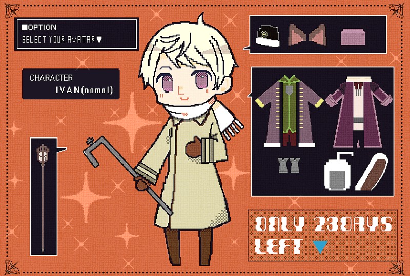 ドット絵っぽくして、ゲームの衣装変え画面っぽくしてみたつもり。