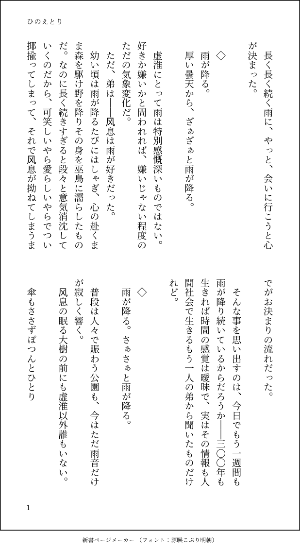 ひのえとり☆quiet followMOURNING40話EDで無事しぼう。最初はもっと明るい感じに終わる予定だった。 show all(+2 images) Tap to full screen (size:618x1132).Repost is prohibited Let's send reactions! freqpopularsnackothersPayment processing Replies from the creator Follow creator you care about!☆quiet follow ひのえとりDOODLEくっ付いてお昼寝する风虚 2 ひのえとりMOURNINGハッピー現パロ。今回は虚淮さんと天虎ちゃんの小話。 ベースは风虚/風虚 いつにも増してmy設定天こ盛りなのでご注意を。 爆炒江湖で天虎ちゃんのスキル(極)はよくある全体厨师烤技法+2だけど、これで虚淮さんの烤スキルがちょっとUpしてるのすごく好き。そんな妄想をコネコネ。 6 ひのえとりMOURNING二枚目は蛇足。・.*:*ஐ꙳。:*.・风息の選択については折を触れ考えてしまうのだけれど、結局彼が彼であるからこそあの結末だろうな、と。彼の執着は龍遊ひいてはそこで暮らしていた幸福な記憶だと考えているのでいっそ小さな頃からひと所に寄らず放浪していたら違ったかもしれないな、とは思う。それはまた寂しい事だけれど。 2 ひのえとりMOURNING虚淮さんが真夜中にパンケーキ作るおはなし。+翌朝のおはなし。爆炒江湖の风息がスキル極めると「场上所有库克烤+45:料理してるキャラの烤技能+45」となるのが有能だし妄想捗るしでたまらないのです。虚淮さんは烤技能持ってないけど风息と一緒なら簡単な烤レシピ(食パンとか)が作れるようになるのがとてもよい。 7 ひのえとりMOURNINGメイド服着てるだけのおはなし。マンネリ防止で色々仕掛けてくる虚淮さん。 2 ひのえとりMOURNING現パロ。风虚がお話してるだけ。これはお付き合いしだして間もない頃。この現パロの虚淮さんは风息とお付き合いするにあたり色々身体を調整したばかりなので、快感は拾えるけどまだ性欲を認識できてない状態。これから风息にあれこれ教え込まれていくのでしょう。 3