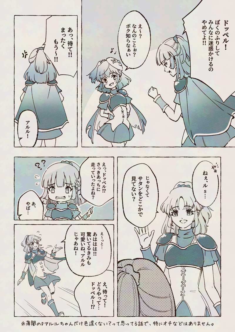 薄闇のDアルルにとくもりが追加されたのを見て…前から思ってたけど薄闇たんだけ色違うよねって。通常と戦乙女は赤だけど薄闇は明らかに紫じゃない?スキル名がヴォイドホールなんで、よんドペちゃんなんだと思うようにしてるけど私の中では紫ドペははめきんドペでリリスなん。いやS社的には、よんドペ=リリス説採用の可能性もないとは言い切れないが。