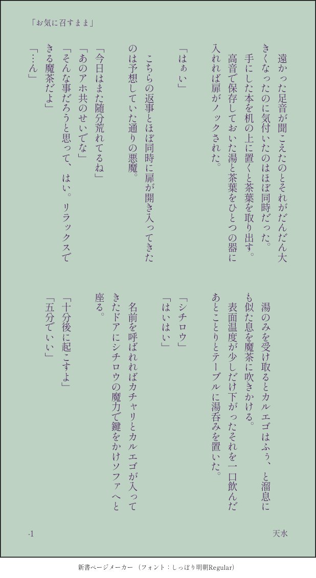 天水☔☆quiet followDONEお題『お気に召すまま』付き合ってるシチカル #シチカル ShichiKal show all(+1 images) Tap to full screen (size:618x1132).Repost is prohibited Let's send reactions! freqpopularsnackothersPayment processing Replies from the creator Follow creator you care about!☆quiet follow 天水☔DONEシチカルオンリーにて公開とある一週間のシチカルです。ロビンは新任の頃。 8 天水☔DONE8月5日、6日開催 白銀の守護鴉と黒紫の番犬2(シチカルWebオンリー)迷路お宝のネットプリント番号です。パスワードはイベント内にて置いてありますイラスト=写真プリント(2L版、L版)2L判対応ですが、L判印刷でも充分な画質が出ることは確認済みです。※確認済みですが印刷範囲の切れは機種によって異なります。小説=文書プリント(A3、白黒)折本の折り方は最後の画像をご参照ください。 11 天水☔MOURNINGコスプレ写真展示シチロウ(学生)×カルエゴ(学生)外伝衣装、微腐表現有(最終ページ)※コスプレ写真苦手な方は御遠慮下さい※※passはイベント会場にて※ 6 天水☔INFOシチカルオンリー用の小話です。闇医者✕金庫番お金で繋がる関係。致してるので18歳を超えた方のみの閲覧でお願い致します。パスワードはイベント内にて 11 天水☔DONE8月5日、6日開催 白銀の守護鴉と黒紫の番犬2(シチカルWebオンリー)迷路お宝のネットプリント番号です。パスワードはイベント内にて置いてありますイラスト=写真プリント(2L版、L版)2L判対応ですが、L判印刷でも充分な画質が出ることは確認済みです。※確認済みですが印刷範囲の切れは機種によって異なります。小説=文書プリント(A3、白黒)折本の折り方は最後の画像をご参照ください。 11 天水☔DONEバビデビ!パーリィナイト・5(春)様にて公開しておりました、シチカルがお話しているだけのマンガです。カルエゴくんは上機嫌。3月19イベント終了に伴いパスワード削除 5 related works sandai_sanTIRED飽きたやつのおまけシチカルたまには悪魔らしい感じのも…と思って暗め。でも多分「俺に止められないはずない」って言い切るよ、えご氏は(〜happy end〜) カノコDOODLEうなじと胸とお股が弱いエゴ ミナセDOODLEにょたえご落書き。年始に描いてあったラフを今頃😅おっぱい出てるので注意。 ミナセSPOILER第191話「イルミ応援団!」感想取り急ぎ言いたいことを少しだけ。 あごだしDONEピカレスクシチカル完成! 2 あごだしDONE🌹が🍲にパフパフしてあげるお話。本番なしだけど、18禁で。 4093 Greatpiyomofu74DONE【🩺🌹💴🍲】半裸、事後表現注意(2/2P)前のらくがきの続きのようなやつ。半裸で事後表現あるので自己責任でお願いいたします。 2 lettuceDONE【飲み会シチカル】前回教師陣に潰されたロウのお礼参りに乗り込んできたエゴくんが潰される話。 5 96910iiyDONE魔フィエゴのチラ見せに狂って書きました。魔フィエゴは多分tkbにピアスしてると思います! R18にしてありますが、直接の描写はないです。 2637 recommended works lettuceDONE【飲み会シチカル】前回教師陣に潰されたロウのお礼参りに乗り込んできたエゴくんが潰される話。 5 168ShinobiDOODLEノリと勢いの「声がききたい」アルアサ ともき9232DOODLEおしおきっくすシチカルパスワード→成人済? 2 tsucikureDONE幽霊に間違われる七啓 2022 ミナセDOODLEシチカル🌹🍲安心してください。入ってませんよ。 96910iiyDONE短編その3 闇金パスワードはバビデビさんのお品書きに。「待てる・待てない・待たない」その3 闇金「待て」ができるかな?の七啓・シチカル・闇金それぞれのお話です。七啓、シチカル、闇金の順で濃いお話になっています。闇金はしっかりR18です。 1583 ナカゾーMAIKINGバビデビさん展示作品。ラフのままですみません🙏 13 in×DOODLE 3 mixmix2DOODLEてならし 絵が描けん