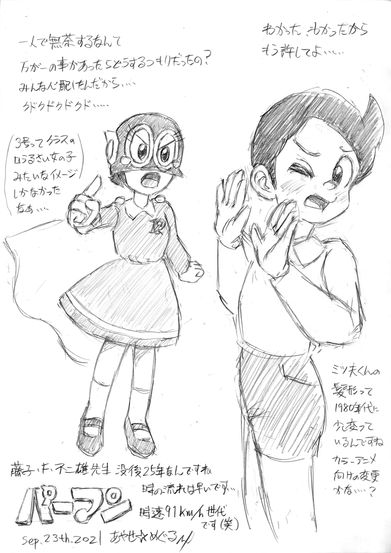 実はパーマンを描くのは初めてで、ミツ夫くんの髪型が 1980年代に変更されていた (シンエイ版 TV アニメ向け ?) 事に気付いたりして興味深かったです。