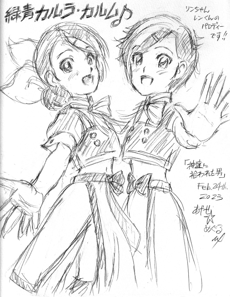 この二人を初めて見た時から、ボーカロイド「鏡音リン・レン」みたいだな~と思っていたので、今回、おフザケ絵にしてみました。衣装や髪型はほぼそのまま (お腹が見える様に変更した程度) なので、まだ検討の余地がありますが…