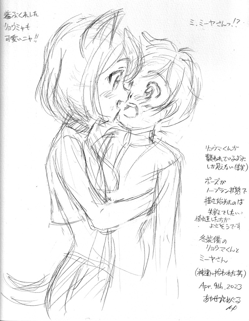 ミーヤさんが、防寒着で着膨れしたリョウマくんを抱き上げ (第2期オープニングアニメーションのように) 頬ずりしようしている場面を描こうとしたのですが、ポーズをノープランで描き始めてしまったのは失敗でした。
