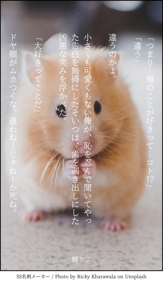 ばびろん🍎☆quiet followMEMOちいさくてかわいい鰐ドフ #SS名刺メーカー ssBusinessCardMaker #鰐ドフ alligatorDof Tap to full screen (size:550x950).Repost is prohibited Let's send reactions! freqpopularsnackothersPayment processing Replies from the creator Follow creator you care about!☆quiet follow ばびろん🍎MEMOド誕用 女の園の星一巻5時間目パロ 6 ばびろん🍎MEMOTL時事ネタヴェル+ドフ ばびろん🍎MEMOこれはいつか書き直したい鰐ドフ。 2 ばびろん🍎MEMOちいさくてかわいい鰐ドフ related works 高間晴DONE映画タイトルで100の挑戦(日本映画編)④http://cinema100de.gozaru.jp/SS名刺10枚。腐要素はありませんがアニメ本編程度の下ネタは含みます。改行・スペース、タイトル等除いて全て140文字です。 10 高間晴DONE「微エロ妄想さんに100のお題」http://2style.jp/sui/nem/100_attention.htmlチョロおそ。100のお題から5本厳選しました。全文はpixivで読めます→https://www.pixiv.net/novel/show.php?id=12094243 5 高間晴DONE映画タイトルで100の挑戦(日本映画編)⑧http://cinema100de.gozaru.jp/SS名刺10枚。腐要素はありません。改行・スペース、タイトル等除いて全て140文字です。 10 高間晴DONE映画タイトルで100の挑戦(日本映画編)③http://cinema100de.gozaru.jp/SS名刺10枚。腐要素はありません。改行・スペース、タイトル等除いて全て140文字です。 10 高間晴DONEチョロおそSS名刺5枚。http://neko2.net/yubi5/「ふれあうひとに6」をお借りしました。 5 高間晴DONE映画タイトルで100の挑戦(日本映画編)②http://cinema100de.gozaru.jp/SS名刺10枚。腐要素はありません。改行・スペース、タイトル等除いて全て140文字です。 10 高間晴DONEベルギクSS名刺5枚。診断メーカー「○○を使わない140字小説お題」を使わせていただきました。 5 高間晴DONE映画タイトルで100の挑戦(日本映画編)⑤http://cinema100de.gozaru.jp/SS名刺10枚。腐要素はありませんがアニメ本編程度の下ネタを含みます。改行・スペース、タイトル等除いて全て140文字です。 10 高間晴DONE映画タイトルで100の挑戦(日本映画編)⑥http://cinema100de.gozaru.jp/SS名刺10枚。腐要素はありませんがアニメ本編程度の下ネタを含みます。改行・スペース、タイトル等除いて全て140文字です。 10 recommended works 高間晴DONEフォロワーさんに影響を受けて書いたベルギク(ベルフェゴール×ギーク)のSS名刺10枚。改行・スペース、タイトル等除いて全て140文字です。 10 高間晴DONEベルギク(ベルフェゴール×ギーク)のSS名刺10枚。改行・スペース、タイトル等除いて全て140文字です。 10 高間晴DONE映画タイトルで100の挑戦(日本映画編)②http://cinema100de.gozaru.jp/SS名刺10枚。腐要素はありません。改行・スペース、タイトル等除いて全て140文字です。 10 高間晴DONE映画タイトルで100の挑戦(日本映画編)⑥http://cinema100de.gozaru.jp/SS名刺10枚。腐要素はありませんがアニメ本編程度の下ネタを含みます。改行・スペース、タイトル等除いて全て140文字です。 10 高間晴DONEベルギクSS名刺5枚。診断メーカー「○○を使わない140字小説お題」を使わせていただきました。 5 moka_ningenDOODLE #ドフ鰐#ドフラミンゴ生誕祭2021#ドフラミンゴ誕生祭2021肌色多めなのでこちらにアップ。エロくはない ばびろん🍎MEMOTL時事ネタヴェル+ドフ 茶和子PAST今まで書いた詩や短歌をぽいぽい 22 椎名七十七(しいななずな)PAST過去絵ならぬ過去の文章作品。相も変わらず上が一番新しいやつ。 13