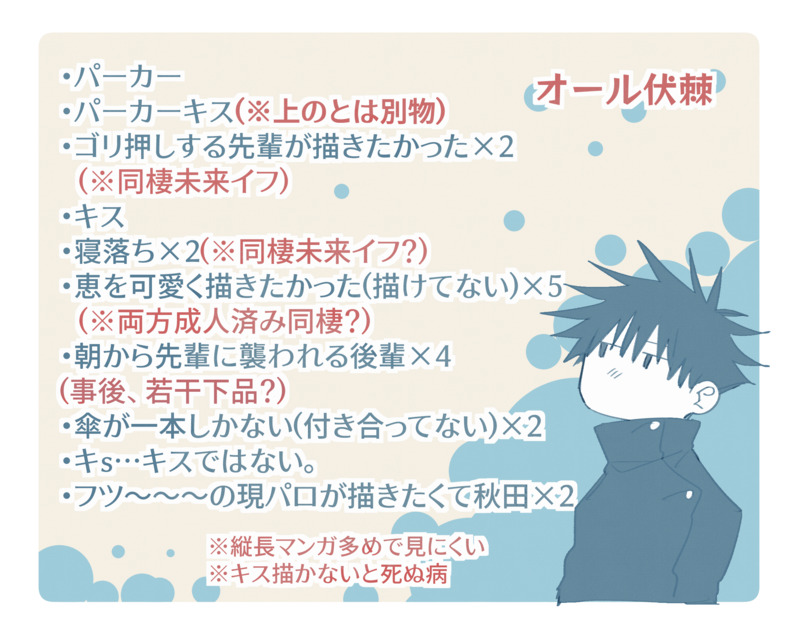 旧垢木犀☆quiet followDOODLE大体注意は一枚目に書きました。ホントに全部落書き。 #伏棘 voluptuous show all(+21 images) Tap to full screen (size:2361x1874).Repost is prohibited 旧垢木犀DOODLEPASS:小説内で最も重要な花の名前(カタカナ4文字)りんこさんの小説→https://www.pixiv.net/novel/show.php?id=16452008※絶対に読む前に見ないでください。小説本編後を勝手に想像して勝手に描いてます。※棘(20)、恵(19)※腕欠損(だけど全然暗くも重くもない)※義手(わからないので大分ふんわり) 11 旧垢木犀DOODLE大体注意は一枚目に書きました。ホントに全部落書き。 22 旧垢木犀DOODLEそれが主目的じゃないのって(略)に付随して「絆創膏が標準装備になってたらいいのに」が発端、段々ズレてく。最後の2枚はちょっと違う、何が違うかは忘れた。4枚目が気に入ってる。 7 related works Linco_jujuDONEとげ誕でアップした「Gomphrena globosa」 の夜のお楽しみ部分です。とげくん視点、心の声多めで進んでいきます。書きたいとこだけ書きました。表現は温いですが、終始inしてるのでR-18で。伏くんが先輩のことを好き勝手にいろいろ呼びます。呼び方にこだわりのある方はお気をつけ下さい。パス:18歳以上ですか? 4 taru_hikikomoriMEMOTwitterで長ったらしくネタを呟いてたやつのワンシーン。これは単に🍙の赤面が描きたかっただけのやつなので、生産するなら小説で生産します。 375DOODLEアイス伏棘n番煎じだけど描いちゃうし、続きの漫画も描きたい、というか描いてる。何処かに上げるかもしれないし自己満で終わるかもしれないけど。 PENNALIADOODLEHINT : 18↑?*日本語2pです 2 375DONE伏棘webオンリー 俺の先輩2 展示漫画(前編)開催おめでとうございます・:*🎊㊗🎊*:・幸せな時間をありがとうございました!拙作へのコメントや応援スタンプ、本当に本当にありがとうございます( ˊᵕˋ*)💕⚠制服が汚れるので任務時のみ高専の制服を着ているという設定の中学生の恵くん⚠狗巻くんは予め五条先生から「恵」と合同任務だと聞かされて来ています 8 osric_k2DONE2022年12月22日 めぐ誕 伏棘SSでっす!!両片想いからの告白だー!! 1462 PENNALIADOODLE............😳💦 3 Linco_jujuDONE棘誕話!!!ワンライで書いたお話の後日談みたいな感じです。棘君視点。特に注意点は無いかと 5 ごまわらびDOODLE勝手に部屋に通ってくる先輩。はっきりさせないでもだもだ進む両片想い的な感じの伏棘。一年生が3人になりましたが、2人の関係は依然もだもだしています。 3265