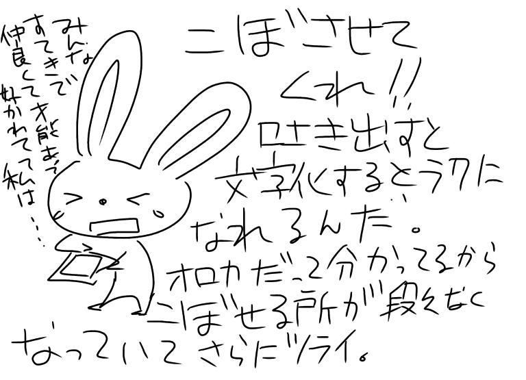 ごめんただの愚痴というか吐き出したい!今まで吐き出せてた所も吐き出しにくくなって。誰にも必要とされてない、下手過ぎて無理、仲良くできてない嫌われてる、優しいから付き合ってくれてただけとかがまだ強い。傲慢だし我儘だよな。気分のムラが激し過ぎて付き合いづらいよな、、よしよし大丈夫ってされたい!励まされたい!!でも、嫌われてるし必要とされてないから無理なんだ、わーーーーんとなってる。寝よう。