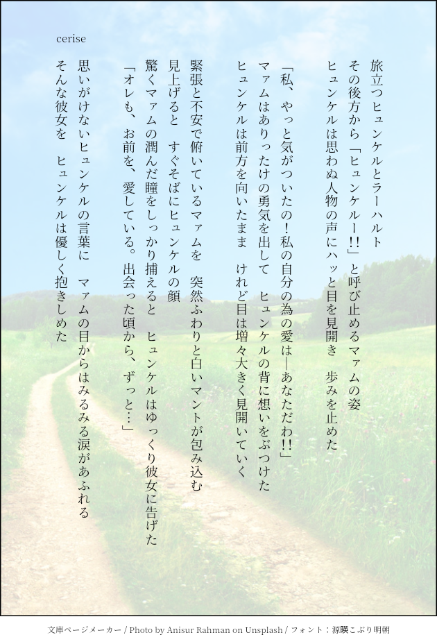ceriseonbunbury☆quiet followDONEハグの日に寄せて。Twitter上の企画『彩りどりの愛─ハグの日をかこう』に参加させていただいたものです。アニメ最終回に、こんな映像が流れたらいいな、という妄想です。主催者様、素晴らしい機会をありがとうございました! #ヒュンマ hygmma #ハグの日 hugDay Tap to full screen (size:630x928).Repost is prohibited Let's send reactions! freqpopularsnackothersPayment processing Replies from the creator Follow creator you care about!☆quiet follow ceriseonbunburyPAST最終回、ポ・マ・メのパーティーは、こうやって決まったんじゃないかな…という私の脳内妄想を放出です。 2 ceriseonbunburyDONE初めて書いたヒュンマ。Twitterの『#キスシーンを14字で書く』に挑戦してみました。それぞれ右側:サイドヒュンケル、左側:サイドマァムのつもりで妄想しました。 3 ceriseonbunburyPASTヒュンマアドベント企画に参加させていただいた時の作品です。たまきずのウィンターホリデー、手袋にインスピレーションを受けました🧤 3 ceriseonbunburyDONE2022ヒュンマ桜フェア出展作品🌸花よりマァムなヒュンケルさん😊 ceriseonbunburyDONEきれいな景色を見ると心が浄化されますね。そんな時に降ってきたヒュンマのラブレターです。 3 ceriseonbunburyDONEシェイクスピアの作品に当てたヒュンマです。①「ロミオとジュリエット」第二幕第二場を、フレイザード戦後のヒュンマのやり取りに変換してみました。②「ソネット」18番を、激重片想い中のヒュンケルversionで。 2 related works simasimadayoneDONEジュンブラフェス記念に描きました!ヒュンマちゃんおめでとう🥳💜❤️せっかく描いたステンドグラス隠れ過ぎた。2024.6.26 2 simasimadayoneDONE獄炎3巻末尾漫画も、ヒュンマ脳にかかればこうなっちまうんだぜ…。ロカに会わせてくれてありがとう!!! simasimadayoneDONE獄炎34話扉絵で情緒が……。一人じゃないよ。そばにいるよ。ずっと…。2023.9.21 simasimadayoneDOODLEまさかの公式ソング、にんげんっていいぞ…!歌うイメージのないヒュンが歌ってる衝撃!!そうだよね聖母のお膝で眠るなら嬉しくて歌っちゃうのかもね…✨インフィニティストラッシュ発売おめでとうございます!!!2023.9.28 simasimadayoneDONEHMFウィンターの為にアバター作ったんですが、ヒュンマCMができました。ドラクエにでてくるあの馬です。 2 simasimadayonePROGRESS続き6pぶん。とんでもねぇところまで来ました。(ラーに何言わせててるんだ)ラーは魔族的感覚の持ち主。 6 真紀瑠唯DONEじょうじさん@jo_jo_joujiが投下されたエルゴヒュが素敵過ぎて、その後のHMFを妄想してしまいました。928号室のじょうじさんと共にHMFを見守る9階の住民設定です。夢小説のように『私』部分を脳内で置き換えてお読み下さいませ。しあわせ子沢山HMF設定の使用許可を下さったじょうじさんに感謝いたします🙏🙏🙏有難うございました! 1016 simasimadayoneDONEヒュンマカーニバルVR2025記念バレンタイン女子会漫画!今回はマァムが恥ずかしがってて楽しかったです。イラストはペーパーに使ってます。このネタ温め続けて3年目、ようやく描けた😂2025.2.7 9 simasimadayoneMEMOにんげんって……の、ヒュンマ的欲望全開な感想叫び。(センシティブ) recommended works simasimadayoneDONE地底魔城ヒュンマ!ネタかぶりしてたらごめんなさい!! simasimadayoneDONE今日は…、今日は…いい風呂の日なんだよ!!いい夫婦はいい風呂に入るよ!! 💜月々❤️PAST『君の色』大戦後の一場面をイメージしました。この後『ラーさん』が起きた設定です。 4 💜月々❤️PASTパーティーかなんかで酔い潰れたマァムさんがヒュンに介抱される話。うちのレオナはすぐ2人を閉じ込めようとするw雑でお恥ずかしい😭もう少し綺麗にお直ししたかった。 6 simasimadayoneDONEヒュンマフェス・ウィンター作品①【言いたい】ミナカトール前にヒュンケルとエイミの槍渡しのやりとりを見て、動揺するマァム。ヒュンケルは自分に向けられたマァムの愛が特別なものである事に気づいている前提です。言っちゃえよぉ……! n_tamakizuPASTまむたんよきよきまとめ 2 n_tamakizuPAST団長スキーツイートまとめ 3 n_tamakizuPAST色んな人のお陰で気づいてゆく。自覚まで後一歩! simasimadayoneDONEヒュンマ・スターフェス作品①ネップリイラスト。 7