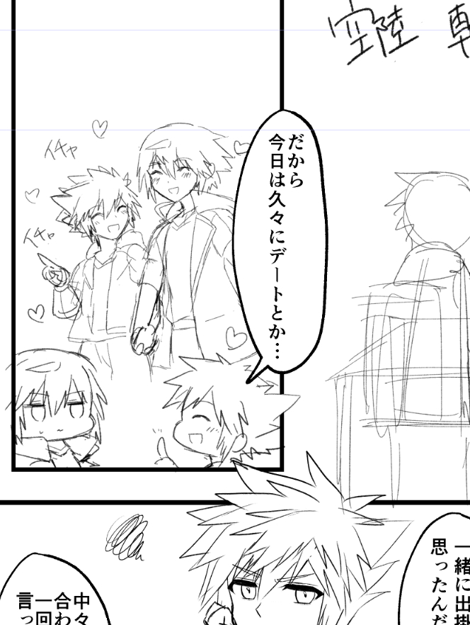 空陸新刊のラフの一部 兼 準備号として載せる一部分。自分で描いてて誰おま(特に陸)状態にじわったけど、こういう風にバカップルキメててイチャコラしてる空陸ちゃん好き