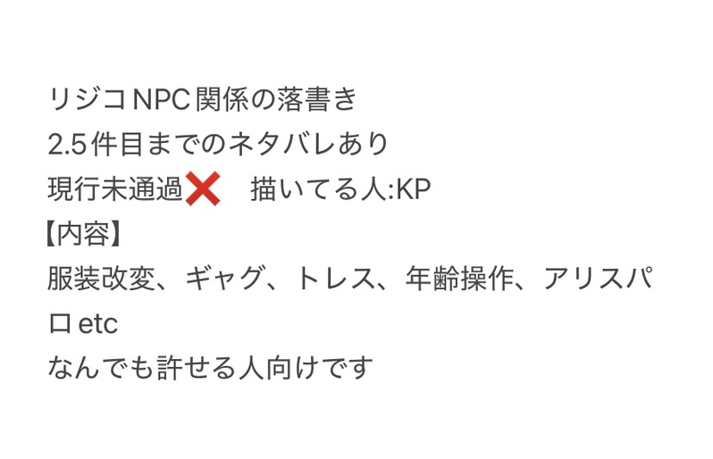 nigemasu4☆quiet followDOODLEリジコNPC落書き2.5話まで。ネタバレめっっっちゃある。ギャンブラーの絡み多め。NPCの服装が違います。現行未通過❌ show all(+7 images) Tap to full screen (size:828x533).Repost is prohibited Let's send reactions! freqpopularsnackothersPayment processing Replies from the creator Follow creator you care about!☆quiet follow nigemasu4SPOILERリジコ部屋素材まとめ 2.5話まで現行未通過❌ ネタバレしかない 11 nigemasu4SPOILERリジコ2.5弁護士オマケシナリオセッション実録ギャンブラー❌ 2.5話現行未通過❌ココフォリアのログを載せてます。全体的に読みにくいです。 4 nigemasu4SPOILERリジコ弁護士オマケシナリオ用素材出来てない!!!!!!!!現行未通過❌2.5ネタバレ⭕️ 9 nigemasu4DOODLEリジコNPC落書き2.5話まで。ネタバレめっっっちゃある。ギャンブラーの絡み多め。NPCの服装が違います。現行未通過❌ 8 nigemasu4DOODLEリジコNPC関係落書き2.5話までのネタバレあり弁護士⭕️ ギャンブラー❌ 7 nigemasu4DOODLEリジコ 2話と2.5話のたぬきの立ち絵 2.5話までのネタバレあり現行未通過❌ 3 recommended works まよ🦭DONEワードパレットでルンバさんよりリクエストいただいたもの・「レンズ越しに」「カメラ」「照れ笑い」・ズマロキ・擬人化リクエストありがとうございました😍ズロは夏が似合うな…と書きながら思っていました☀️🏖️ 3616 山賊くんDOODLEみみとがりとパーマネントの、距離が何か近い💕個人的にくびふとし刑事推しです❣️❣️ muimui_taINFOCoc『デストルドーの使者』KP:おまつさんHO1:間宮 真澄/87さんHO2:入間 聖人/むーーエンドAープル夜エンドA→デス使エンドAなんてシナリオだよ……!お疲れ様でした…!本当に…!……頑張ったね… 雪風(ゆきかぜ)。DONEいちいち動きが美麗でかっこいい翠くん💕✨ 森野クマ3PROGRESS今日の進歩480階段の部分で時間使いすぎてあまり進めなかった とちちとせDONEとち王子ちとせが楽しい羽根つきメイドのちとせちゃんに誘われ、羽根つきをすることになったとち王子。はたして、羽根つきの結果は?(2025年制作)2025/01/15公開 11 ロットDOODLEロザクラ※紺さん( @konkonkonkonw )の『灰色の鍵』FA。▼御本家様の作品https://x.com/konkonkonkonw/status/1873755029364175323 ユキまるのなんでも置き場DONE夢のダブルちやりさんが出来ました♪( ◜ω◝و(و私初の東方絵で東方男体化やで(⸝⸝⸝´꒳`⸝⸝⸝)テレッ 紫月ゆかりDONEさきに載せたバニーぎじにょジノさんのイロチverです⭐🐇(上衣だけですが)やはりジノさんなら青でしょ❗って考えてたのでお遊びでイロチ作りました💙またロン毛verありまスこちらも加工した絵に変更しました🙇♀ 2