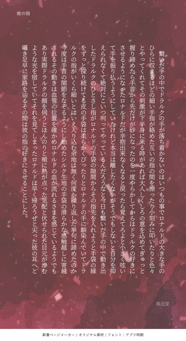 fjd_94☆quiet followMOURNING自分の文章に飽きた頃にこうやって句読点皆無なのを書くクセがあります。 #ロナドラ小説 lonadoraNovels #ロナドラ Rona x Dra Tap to full screen (size:618x1132).Repost is prohibited Let's send reactions! freqpopularsnackothersPayment processing Replies from the creator Follow creator you care about!☆quiet follow fjd_94MOURNING年明け頃になんとなく思い付いて書いた話です。あまりにも短い&季節ハズレ感がスゴイですが、せっかくのWEBオンリなので!(言い切った 2 fjd_94PAST「ロナドラ版深夜のお題」で書いた読ロドです。 6 fjd_94MOURNING自分の文章に飽きた頃にこうやって句読点皆無なのを書くクセがあります。 fjd_94MOURNING約2年前に作ったネタ小話。この頃は久々の2次創作が身に付かなくて右往左往しながら感覚を取り戻そうとして色々と出力してた記憶。元ネタに関して、私は旧訳の方が好みです。 fjd_94DONE約2週間遅れでのVDネタ。まだできてないロドでお送りします。TwitterというかX?上げた後に誤字脱字に気付いた(あるある過ぎて虚無顔)のでこっちに再投稿しました。 6 fjd_94PROGRESS去年(⁉︎)のロ誕開催のソファ棺9で公開した話の続きを買いてますが、書いていくうちにネタがもりもり増えてって終わる気配が感じられないので、一旦ここまで。「来年の8/7までは誕生日」と唱えながらやってますが、終わるのか…?(自分が一番信じられない 7674 related works kei94DONE #2023RDすレナべ交換会 用です!温泉旅行に行った本編ろどが帰り道にカーセッセ!服装はヴリンスアロハです。♡、濁点喘ぎ。隠語は今回少なめ(当社比)二人がえっち好きすぎるとか、色々ご都合主義!だってskbさせたいから!よろしくお願いしますけべ!20231001追記10月になったので公開します成人済みですか?#2023RDすレナべ交換お披露目会 14299 グタペルカDONEいいおっぱいの日と言うことで短めですが書きました前に書いた、いいおしりの日と少しだけ関連がありますが、単品でも全く問題ないです※♡、濁点あえぎありパス→成人?y,n+いいおっぱいの日(数字4桁) 3130 fjd_94PAST「ロナドラ版深夜の創作一本勝負」20221217開催、第六回お題【愛と食卓】【元気になあれ】より。 4 minorushimDONE支部にも上げてるのですがこちらでも。初投稿でございます。ソファと棺桶9開催おめでとうございます!無自覚両片思いからのモダモダのお話です。よろしければご覧下さいませ。 16332 fjd_94PAST「ロナドラ版深夜の創作一本勝負」20230121開催、第八回お題【両片思い】【あと一歩】より。 4 kei94DONEツイッタで流行っていた『【R-18】性癖お題ボタン』で「30RTで媚薬責めされて体中が疼いて泣きながらイキまくる受けを書きましょう!」が出たので書きました。【朗報】やってるだけ!隠語、受け攻め両方に♡喘ぎ、濁点、んほぉ系もちょっと!ちょっとだけ異物挿入!ただいちゃいちゃしてるだけですが、こんな相思相愛の二人が死別するはずないのでハピエンです!成人済み? 7533 fjd_94PAST「ロナドラ版深夜の創作一本勝負」20230204開催、第九回お題【どうして俺(私)が】【素直になれない】 2 suz_kisaDOODLE(ロナドラ)今週の本誌321死ネタ。(自覚あり。付き合ってません軸)あの後も幼児退行の後遺症残ってたら…と妄想しました。勢いで書いたので生暖かい眼差しで読んでください。本人たちは真剣です(一応)大人ロナ君は最後にしかいません。今回の巻き込まれる被害者はウスパパです。ほんのりウスミラ。 4961 グタペルカDONEいいおしりの日のロナドラです後半からえっちパート※濁点と♡あえぎがありますパス→成人?y,n+いいおしりの日(数字4桁) 4673 recommended works nemurinekomaruPROGRESSロナドラ♀里帰り出産の続きのノス視点です。ノスはドラちゃんを娘みたいに思っているので、元から眼中になかったロナ君を許せないしちょっと嫉妬している。 6551 _baisenDONEソファと棺桶6にて公開させていただいてるネップリのイラスト及び印刷番号となります*ローソン&ファミマとセブンイレブンで印刷期間が異なります、ご注意ください*プリントはマリンと派生が一緒のものだけ2L判で後の物はL判でお願いいたします*フチなしでの印刷可能 5 etu_miso_DOODLE反転のひん剥かれキョンシーキョンシーおじさまは自分で何もできないからお世話してあげる必要があるじゃないですか大丈夫大丈夫体拭いてあげるだけだから清潔にしてあげるからね大丈夫大丈夫いらんくらいに優しく拭いてくれるよ死神お嬢はだから安心してね!!!!!ね!!!!、!、!!!!18才以上ですか?? 2 ちゅうDONE30年後。たまにはドちゃん側から。ワンライ参加作品、お題【そんな君が好き】+1.5hこのあとルパンダイブかます勢いのロくんは戻ってきた◯さんにどつかれるんじゃないですかね。わからんが。 4 きーあDONE30年後もおとなりで 展示作品30年後ロナドラで、ドラルクのストーカーに見せつけっクスをするロナルド君のお話(ドラちゃんは気づいてない)。モブがひたすらかわいそうですが、ロナドラはハッピーです。パスワード:18歳以上ですか? 15 Ruteru_nDONE淫紋ネタ。完成しました!前の内容から若干の視点