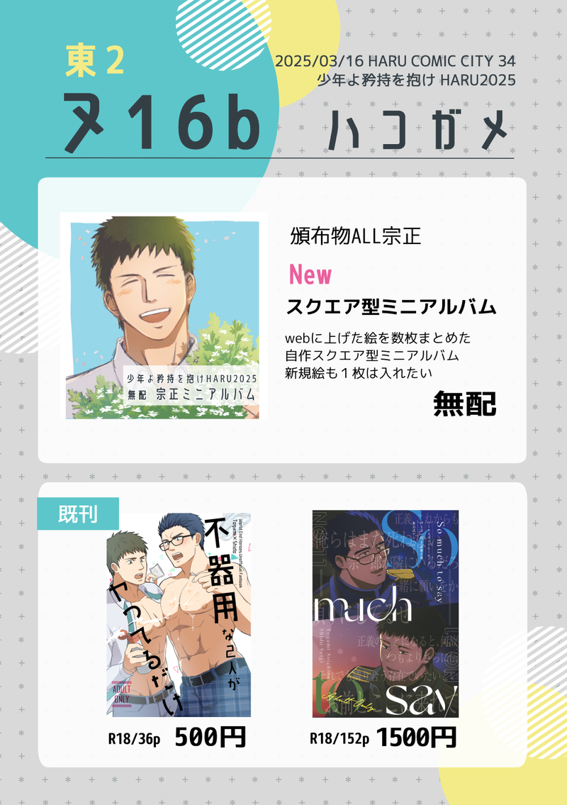 C_suzukii☆quiet followMENU3/16のお品書きです。新刊のかわりに無配のミニアルバム作ります。手製本なので個体差あり。よろしくお願いします! #whr #宗正 zongzheng Tap to full screen (size:1000x1419).Repost is prohibited Let's send reactions! freqpopularsnackothersPayment processing Replies from the creator Follow creator you care about!☆quiet follow C_suzukiiINFO10/19 SPARK発行のチャンピオン本に寄稿してます。ナインピークスで不知火&桃栗のマンガ2p、乱破で望月先輩のカット&フリートーク1pです。東5ヌ27a 漫画脳 さまにて頒布予定。よろしくお願いします! 2 C_suzukiiDOODLE9/21イベントありがとうございました。お祭り気分満喫できました!誕生日だからって無配に慧吾のカット入れたらプライバシー侵害マン的文脈が発生してしまった。スマン。あとBEASTARSアンソロにお誘いいただきました。人生初のケモエロです。ヤフゴで4ページです。よろしくお願いします!(リンク先R18)https://www.pixiv.net/artworks/134610321 4 C_suzukiiMENU9/21のおしながきです。予定してた新刊は1/25の矜持10に回します。すみません!机に置くものが少ないので賑やかしに創作本も置いてます。よろしくお願いします! C_suzukiiINFO9月21日の矜持9申し込みました。唐突にリバ描きたくなったのでリバです。前後編に分けて9月は前半の宗正パート。実質宗正。分ける意味あんまないけど分冊をやってみたかった。 C_suzukiiDOODLE尻と太ももが描きたかった。手癖で短髪描きがち。 C_suzukiiDOODLEカジュタカッ! related works はるみちPROGRESS顔はともかく体が描けなすぎる底辺絵描き、挫折寸前光希くんは初描きです はるみちDOODLE※4章81話バレかもしれない絶望と無謀の半歩先で希望と未来を繋いだふたり はるみちDOODLE晃巡 なんでもないらくがき本編からの現実逃避とも言う @tm_a0iDOODLE某スクエニゲーのキャラの衣装絶対似合う…と着せましたが色々力尽きた。元ネタ伝わる方いるんだろうか… はるみちDOODLE倫柊守りたいものに一途で その為にすべてを尽くすところが似ているふたり 理不尽な世界の被害者でもあるふたり思うところはあれどお互い必要以上に干渉しない感じがいい はるみちDOODLE晃巡 81話バレかも _X217X_DOODLE色々背負って家族を守る伊勢崎の話はまだですか? はるみちDOODLE探偵イベ 概念矢頼兄弟(というか勇紫) 幼少期捏造根本的に異母兄弟で別々に暮らしてたけど紫の母親が死んだとかで勇のいる本家に来たけど周りからは色眼鏡で見られてる(勇は周りの態度がなんとなくムカつくから自分は普通に兄として接してるけど紫は距離感掴めなくてまだ怖がってる)みたいなそれ紫の目は生まれつきのやつであってほしい(全部願望) @tm_a0iDOODLEイベント前の幻覚。楽しみ&怖い…(イベ開始後追記)最高でした。二枚目はちょっと直したやつ。 2 recommended works 2GMDOODLE崖縁は…最高ですね…絵柄的に浅桐くんが1番描きやすかったです。 トコ指揮官OFFICIALワンドロよう 2 shiobachiDONE トコ指揮官TIRED敬くんと正義くんそのうちちゃんと色を塗ろうね 2 みかんDOODLE春飛んで夏 つきかげDONE巡くん誕生日絵の差分 ふじさわDONE矢後さんと1年生の漫画風雲児1年生居ないし、1年生的にテンション低めのたまにかまってくれるヤンキーポジだったらいいのになぁって光希くんが試してみた場合、白星勢はマジかよってやんわり光希くんに注意ぐらいで特に矢後さんに言うことはないけど頼城さん知ったらが矢後さんにしこたま説教しそうって思ってます。 4 QxQDOODLEらくがき 7 nna-DOODLE夏のゃご!