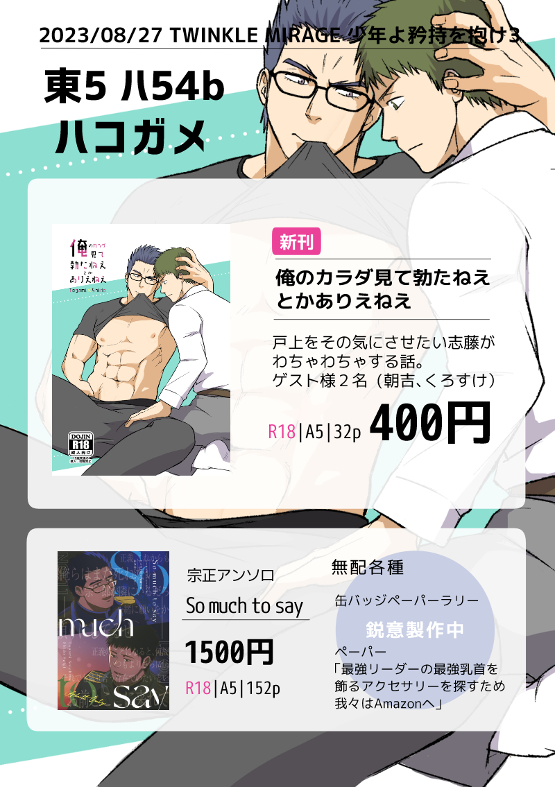C_suzukii☆quiet followMENU8/27矜持3のお品書きです!よろしくお願いします! #宗正 zongzheng #whr腐 Tap to full screen (size:800x1135).Repost is prohibited Let's send reactions! freqpopularsnackothersPayment processing Replies from the creator Follow creator you care about!☆quiet follow C_suzukiiDOODLE9/21イベントありがとうございました。お祭り気分満喫できました!誕生日だからって無配に慧吾のカット入れたらプライバシー侵害マン的文脈が発生してしまった。スマン。あとBEASTARSアンソロにお誘いいただきました。人生初のケモエロです。ヤフゴで4ページです。よろしくお願いします!(リンク先R18)https://www.pixiv.net/artworks/134610321 4 C_suzukiiMENU9/21のおしながきです。予定してた新刊は1/25の矜持10に回します。すみません!机に置くものが少ないので賑やかしに創作本も置いてます。よろしくお願いします! C_suzukiiINFO9月21日の矜持9申し込みました。唐突にリバ描きたくなったのでリバです。前後編に分けて9月は前半の宗正パート。実質宗正。分ける意味あんまないけど分冊をやってみたかった。 C_suzukiiDOODLE尻と太ももが描きたかった。手癖で短髪描きがち。 C_suzukiiDOODLEカジュタカッ! C_suzukiiDOODLEバチバチシリーズ再読。死んで生きれるか。 related works みどりしろこPAST戸志と色差分 2 みどりしろこDOODLER-18手前 戸志 みどりしろこDOODLE【R-18】戸志https://poipiku.com/IllustViewPcV.jsp?ID=791653&TD=3369577の差分 みどりしろこDOODLE戸志 みどりしろこDOODLEいかがわしい戸志らくがき C_suzukiiMENU8/27矜持3のお品書きです!よろしくお願いします! C_suzukiiMENU矜持7お品書きです。よろしくお願いします!新刊はbooth、FOLIOでの通販も予定してます。リンク先R18https://hkgm.booth.pm/items/6169558 みどりしろこPASTいっこ前に投稿したやつのキス差分(雑コラ) みどりしろこDONE【R-18】某さんお誕生日おめでとうスケピク