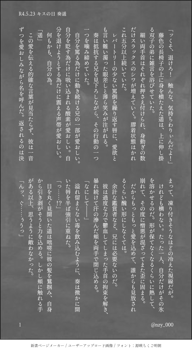 nzy_000☆quiet followDONE👅🍨 キスの日SS。べろちゅーなのでポイピクへストーリーもヤマもオチもなにもないです。 show all(+1 images) Tap to full screen (size:618x1132).Repost is prohibited Let's send reactions! freqpopularsnackothersPayment processing Replies from the creator Follow creator you care about!☆quiet follow nzy_000MOURNING今年のニジョ誕に書くはずだった奏遥小説の端っこいつか書きたい…の気持ちだったけど多分もう続きを書くことはないので供養最後はただのプロット 1277 nzy_000SPOILER👿のメインストーリー最終章書き起こし個人的なメモのため転載などはお控えください 9684 nzy_000MEMOキミステ二条画像まとめ遥→奏の順にカード画像→メモリーボイス→SD画像→立ち絵各衣装→絆トレーニングGIF(0.5倍速) 23 nzy_000MEMOキミステ背景まとめバンドレベル報酬はMAX時のみ 28 nzy_000PAST過去アプリ(ダブエス)時代の全キャラヒストリーです。並び順がバラバラだったり一部編集ミスがありますがご容赦ください。少しでもキャラを愛する方々や創作者様のお役に立ちますように。 50 nzy_000PAST⚠️やまかな 遥が死んでる&奏の精神が危ういキミステ出るよりかなり前に書いた物、なんでも許せる人向け 6 recommended works 夏の枝蛙DOODLE hGu8Bv7tU9eUBxcDONEタマシュナ、臍ネタくらーい2人母体回帰願望ちっくなジャミル18歳以下は閲覧をお控えください 2235 水师傅DOODLE『成御向』妈有批⚠️ 3 Agui_chARTDOODLEAether strap adventures! 6 mnitoemDOODLE2024.12.21-22烏詠webオンリー開催ありがとうございます!展示・ネップリのみネップリはユモまめの時に掲載したもの(色味柔らかバージョン)になります!どんな感じか不安な方は印刷してきたのを夜アップしますのでそれからでも!🙇♀️【21:00ネップリ参考写真追加しました!色味変えたもの追加するかもです🙇♀】もしよかったら書き込みボードなどで構っていただけたら嬉しいです! 6 kidatoshiwoDONE遅ればせながらこちらにも。hacchiおたおめ! suzushiro391DONEMua先輩🐋 継続用私服差分11種ネタバレは特にないです。 11 kaina_pictureCAN’T MAKEイラスト94黒ウィズ、リフィルのファンアート。顔と色塗りが難しすぎる。うまくなる方法何かないかな~#イラスト #イラスト初心者 #ファンアート くさったおにぎりって奴DOODLE絵チャのペンがいい感じなんだけどアイビスの筆圧設定をいじりたくないので、ココで色々描かせて頂いております(は?) 9