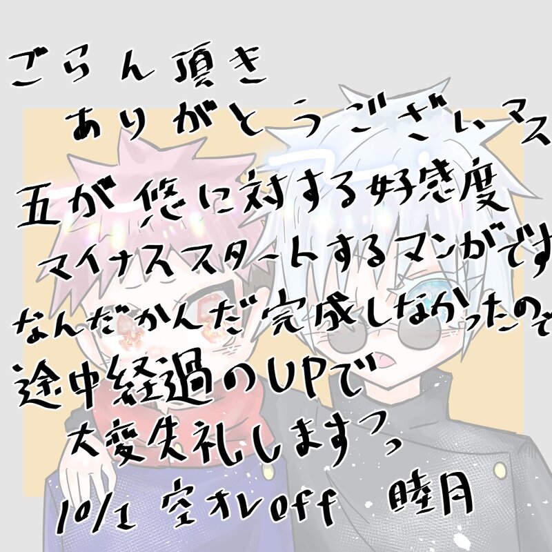 睦月🌙.*·̩͙☆quiet followPROGRESS呪専五悠漫画、途中経過 show all(+2 images) Tap to full screen (size:1000x1000).Repost is prohibited Let's send reactions! freqpopularsnackothersPayment processing Replies from the creator Follow creator you care about!☆quiet follow 睦月🌙.*·̩͙PROGRESS呪専五悠漫画、途中経過 3 睦月🌙.*·̩͙MOURNINGラフとか未完成のものたち供養 20 睦月🌙.*·̩͙PAST今まで描いた漫画っぽいもの 4 睦月🌙.*·̩͙PAST今までのイラストまとめです!カプ絵だけではなく、単体絵も含みます。 27 recommended works MoonSaDONE中国语注意,最强夹心,夏油,五条高专教师设定 yixiaokouzhouDOODLE很多虎妹!基本没有五的五悠(//̀Д/́/)第一次发画请多指教!不喜勿喷! 2 アキサカPROGRESS五悠ペン入れ終わり uno_tawashiDOODLE0721の日なので!してるのはゆじだけだけど五悠です 2 ゐちごゐちえTRAINING何か違う五夏※ちゅーあり※新手のお姫様だっこ 3 みかんちゃん🍊DOODLE初投稿 夏五喧嘩漫画の一部です完成させる気が起きないから一番うまく描けたとこだけあげます。 raiDONEバレンタインのお話しです。宿さんと釘さんと虎くんがおしゃべりしてます。 32 PudinmuackDOODLE 5 koooog1208DONE #五悠5️⃣🐯ふぇPASSはプロフ欄誕生日4桁です(フォローしていただけると表示される設定にしてあります 2