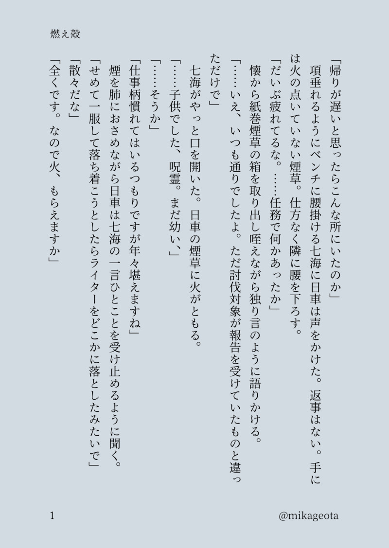 suzuro☆quiet followDONE七寛。シガーキスする二人のお話。 #七寛 sevenBroad show all(+1 images) Tap to full screen (size:1890x2664).Repost is prohibited Let's send reactions! freqpopularsnackothersPayment processing Replies from the creator Follow creator you care about!☆quiet follow suzuroSPOILER本誌ネタ注意。虎杖君と日車さんが宿儺戦へ赴くまでの妄想捏造話です。 2132 suzuroDONE日車さんと清水さんの二審前日にあったかもしれない日常のお話。 2006 suzuroMOURNINGじゅそ虎概念の虎日(雰囲気)。女性下着、潮吹き、ア…ルプラグなど出てくるので大丈夫な方はどうぞ。 4357 suzuroREHABILI日車さんいつの間に合流したんですか?という気持ちを自分なりに補完した散文。謎時空。虎日です。 2 suzuroMOURNING入れ替わりネタ。🐯(中身🍭)×🌻虎日のような篤寛のような。 2648 suzuroDONE新刊BOOSTのお礼SSです。虎日がデートする話。このたびはありがとうございます! 5 related works suzuroDONE七寛の日(7/16)に上げたSS。ビアガーデンで浴衣デートするお話。 5 suzuroDONE七寛。シガーキスする二人のお話。 2 rena_xx000MOURNINGフェ…しないと出られない部屋に閉じ込められた七寛 割と思いきりの良い7️⃣と流されやすい🌻 挿入はなし エロは7️⃣のフェラシーンのみ 3192 さわら茶渡DONE企画参加のもの寛七前提の寛←呪詛七?緊縛がテーマでした 18↑? 1622 随(まにま)MOURNINGタイトルふざけてるだろと思ったそこの貴方、正解ですふざけました。ぽたさんと盛り上がった7️⃣(情報屋)×🌻(陸軍大佐)の七寛です。pass→七寛の日を数字4文字で 2760 suzuroDONEぽたおさんからネタをいただいた七寛。若干いかがわしいです。 2955 よこ研究ノートDONEバスローブ寛七/七寛二次創作のBL嗜むようになったのが結構最近なので色々大目に見ていただけると幸いです…バスローブでイチャイチャする2人が描きたかったんだ… 2 suzuroDONEリクのわからせっ七寛。痴話喧嘩。 1982 kanashiki79DONE七寛、ジュソミンに遊ばれてる🌻さん。---------------------------相互さん言↓↓↓遊びの為だけにデパコスの口紅買って塗って🌻センセにチュー(塗ったの)したのを拭う…かなぁ?出会った頃のまだギスギス関係?