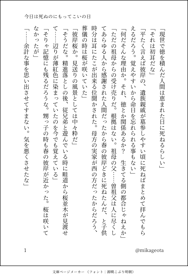 suzuro☆quiet followMOURNING紺屋さんのお題『今日は死ぬのにもってこいの日』をお借りして書いた🍭🌻🍭 #🍭🌻🍭 show all(+2 images) Tap to full screen (size:630x928).Repost is prohibited Let's send reactions! freqpopularsnackothersPayment processing Replies from the creator Follow creator you care about!☆quiet follow suzuroSPOILER本誌ネタ注意。虎杖君と日車さんが宿儺戦へ赴くまでの妄想捏造話です。 2132 suzuroDONE日車さんと清水さんの二審前日にあったかもしれない日常のお話。 2006 suzuroMOURNINGじゅそ虎概念の虎日(雰囲気)。女性下着、潮吹き、ア…ルプラグなど出てくるので大丈夫な方はどうぞ。 4357 suzuroREHABILI日車さんいつの間に合流したんですか?という気持ちを自分なりに補完した散文。謎時空。虎日です。 2 suzuroMOURNING入れ替わりネタ。🐯(中身🍭)×🌻虎日のような篤寛のような。 2648 suzuroDONE新刊BOOSTのお礼SSです。虎日がデートする話。このたびはありがとうございます! 5