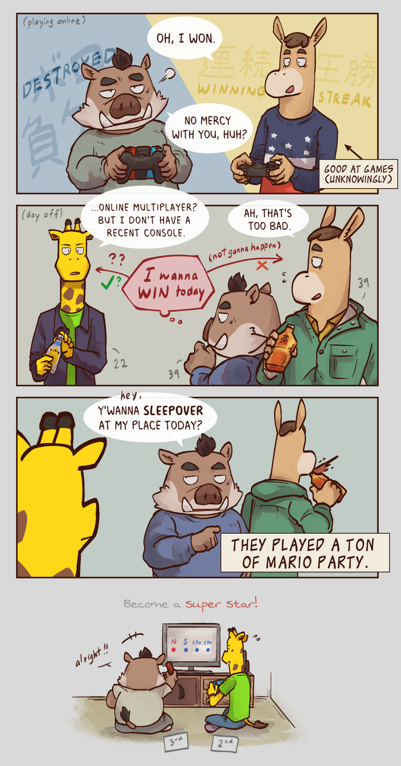 N: good at games, mostly does 1-player