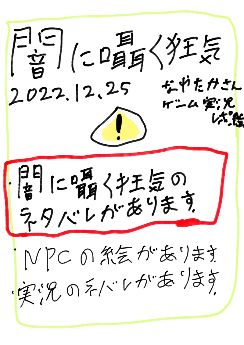 sakai_yuduki☆quiet followSPOILERなやたかさんの闇に囁く狂気実況レポ絵※ネタバレ手文字注意 #実況レポ絵 liveRepoPicture show all(+1 images) Tap to full screen (size:1240x1754).Repost is prohibited Let's send reactions! freqpopularsnackothersPayment processing Replies from the creator Follow creator you care about!☆quiet follow sakai_yudukiSPOILER #内藤某となや高組シナリオ、セッションのネタバレがあります!個人的に可愛かったシーンです。 sakai_yudukiDONE創作漫画『You Are The HERO 』第7話【ヒーローみたいだ】※グロ表現などあります。出口に向かっていた英翔と芥生。だが愛萌の幻覚により元の場所に戻ってしまう。英翔はMOTEHになった宮永を救う事ができるのか? 66 sakai_yudukiSPOILER #遥か遠きエディンバラへ『遥か東京エディンバラへK視点1日目』の個人的に面白かった所のレポ絵になります。ネタバレがあります。未視聴者は×です。まだ、漫画にするにあたりのセリフの少し改変やキャラの服装などの間違いなどありますすみません。あと手書き文字が汚いです。 8 sakai_yudukiDONE創作漫画『You Are The HERO 』第6話再会と無双。※グロ表現があります。連れ攫われた英翔を見つけ出す芥生たち。芥生は敵の1人を知っていて……の話です。 81 sakai_yudukiSPOILER世界で一番うるさいジャンパのセッションで個人的に面白かった所などを描いたものです。ジャンパのネタバレ、npcのネタバレがあります。未通過、未聴者の方は注意して下さい。 7 sakai_yudukiDONE創作漫画『You Are The HERO』第5話悪の定義。※グロい表現があります。誘拐した青年に『遊び相手になってくれ』言われ心臓をくり抜かれる主人公、英翔。その後の話です。 59 related works sakai_yudukiSPOILERなやたかさんのサイコブレイク2実況レポ絵②※ネタバレ手書き文字注意2023 9月25日 3 sakai_yudukiSPOILERなやたかさんの大逆転裁判1&2実況③レポ絵※ネタバレ手書き文字注意 2 sakai_yudukiSPOILERなやたかさんのサイコブレイク実況②レポ絵※ネタバレ手書き文字注意 5 sakai_yudukiSPOILERなやたかさんのバイオRE3実況③レポ絵※ネタバレ手書き文字注意 4 sakai_yudukiSPOILERなやたかさんのポケモン ヴァイオレット実況レポ絵②※ネタバレ、手書き注意2023 10月22日 6 sakai_yudukiSPOILERなやたかさんのサイコブレイク2実況レポ絵①※ネタバレ手書き文字注意2023 9月25日 5 sakai_yudukiSPOILERなやたかさんの怪異症候群3実況③レポ絵※ネタバレ手書き文字注意 4 sakai_yudukiSPOILERなやたかさんのポケモン ヴァイオレット実況レポ絵①※ネタバレ手書き注意2023 10月16日 7 sakai_yudukiSPOILERなやたかさんの怪異症候群2実況②レポ絵※ネタバレ手書き文字注意 3 recommended works 嵐夢えむDOODLE【ΔRUNE】🍰メカバレ/冷却水(のつもり)普通に可哀想だしリョナ気味なので大丈夫な人はどうぞ…! sakai_yudukiSPOILERなやたかさんのバイオハザード7実況レポ絵※ネタバレ手書き文字あり 2 sakai_yudukiSPOILERなやたかさんのバイオ7実況②レポ絵※ネタバレ手書き文字注意 4 sakai_yudukiSPOILERなやたかさんのバイオ7実況③のレポ絵※ネタバレ手書き文字注意 3 sakai_yudukiSPOILERなやたかさんのバイオ7実況⑤レポ絵※ネタバレ手書き文字注意 4 sakai_yudukiSPOILERなやたかさんのバイオ7実況⑥のレポ絵※ネタバレ手書き文字注意 4 sakai_yudukiSPOILERなやたかさんのバイオ7ex ②実況レポ絵※ネタバレ手書き文字注意 4 sakai_yudukiSPOILERなやたかさんのバイオ村①?実況レポ絵※ネタバレ手書き文字注意 3 sakai_yudukiSPOILERなやたかさんの零〜濡鴉ノ巫女〜実況②レポ絵※ネタバレ手書き文字注意 4