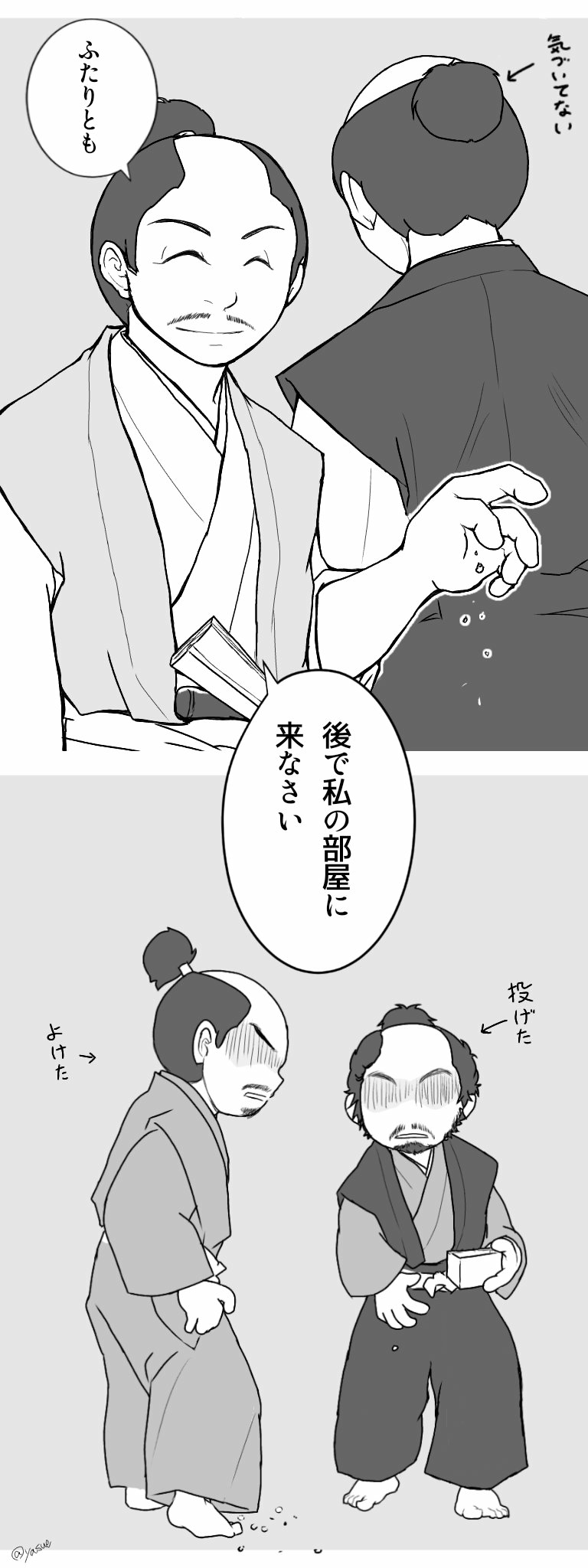 話題にしていたからか、ちょうど窓から見える渡り廊下のその先に藍曦臣と藍忘機の姿が見えた。彼らが歩くたびに、長さのある抹額は風に揺れて、ふわりひらりと端を泳がせている。示し合わせたわけでは無いが、魏無羨は藍忘機を。そして江澄は藍曦臣の姿をぼんやりと見つめた。