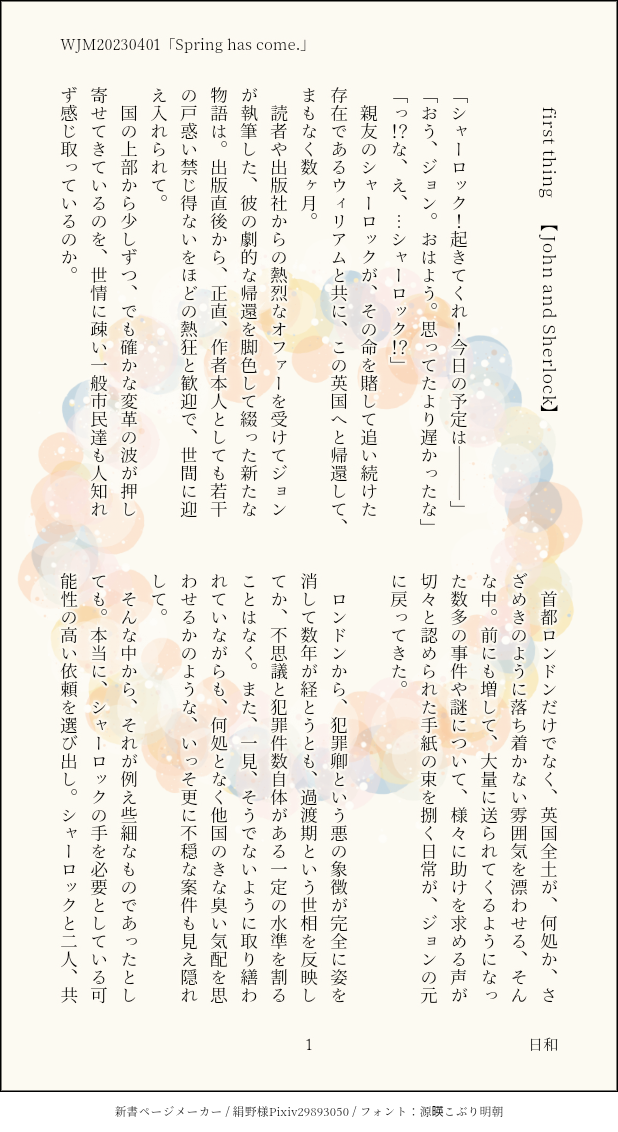 ジョン&シャーロック、フレッド&ウィリアム、シャーロック&ウィリアムのある春の一日の出来事3連作。