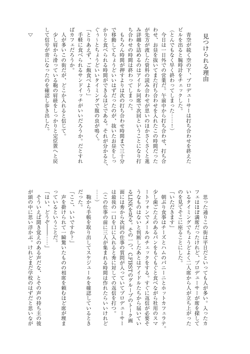 xyk3ykx☆quiet followDONE『見つけられる理由』花園百々人×女性プロデューサー外で偶然プロデューサーが百々人に会う話。照れる百々人くんを見てちょっと意識してしまうぴぃちゃんがいたらいいな。 show all(+3 images) Tap to full screen (size:2042x2893).Repost is prohibited Let's send reactions! freqpopularsnackothersPayment processing Replies from the creator Follow creator you care about!☆quiet follow xyk3ykxDOODLEいつかこの続きを書きたい春名くんとプロデューサーのお話。プロデューサーに彼氏がいた設定なのでご注意ください。うまくいけば9月に発行予定です。 4715 xyk3ykxDONE『見つけられる理由』花園百々人×女性プロデューサー外で偶然プロデューサーが百々人に会う話。照れる百々人くんを見てちょっと意識してしまうぴぃちゃんがいたらいいな。 4 xyk3ykxDONEサンタクロースのお仕事をした享介くんが事務所にいる監督に会いに来る話。 5 xyk3ykxDONEクリスマス当日、お仕事終わりにイルミネーションを見に行く二人です。 4 xyk3ykxMEMOクラファのエピゼロ2話を読んで、もしいつかぴぃちゃんが諸事情で退職(結婚とかではなく実家のうんぬんかん)しても、捨てられた訳ではないのであれば彼は「僕がキミに会いたかったから会いに来たんだよ」という話を書きたいなと思った。いつか。 xyk3ykxINFO3/21にて発行する百々P♀小説本段組サンプルです。 14 recommended works xyk3ykxINFO3/21にて発行する百々P♀小説本段組サンプルです。 14 Mizu_milkteaDOODLE私得🇰🇷ぽイメソンらくがきです 2 xyk3ykxDONEクリスマス当日、お仕事終わりにイルミネーションを見に行く二人です。 4 ごった煮ミソスープSPOILER最強の軍師初日に2回観た感想とりあえず描いておきたいところ描き殴り2枚目以降は留三郎中心の感想ですアナログなので読みにくいです※抜群の漢字間違えてた!恥ずかしい!見ないでください 4 井倉めじかMAIKINGここんとこマリア描いてなかったから別嬪さんコンビ 線画のみ あとでラフに塗ろう kanrai2020DOODLE仕事納め なるかみうめこDOODLEねがあすクラン🐱クランは可愛い piri_tomatoDONE描き納め2024 part1お久しぶりの景彡山家っ👴🏻🧒🏻👶🏻今年もたくさんお世話になり、ありがとうございました! ニワノDOODLEクソデカ腕章として活用