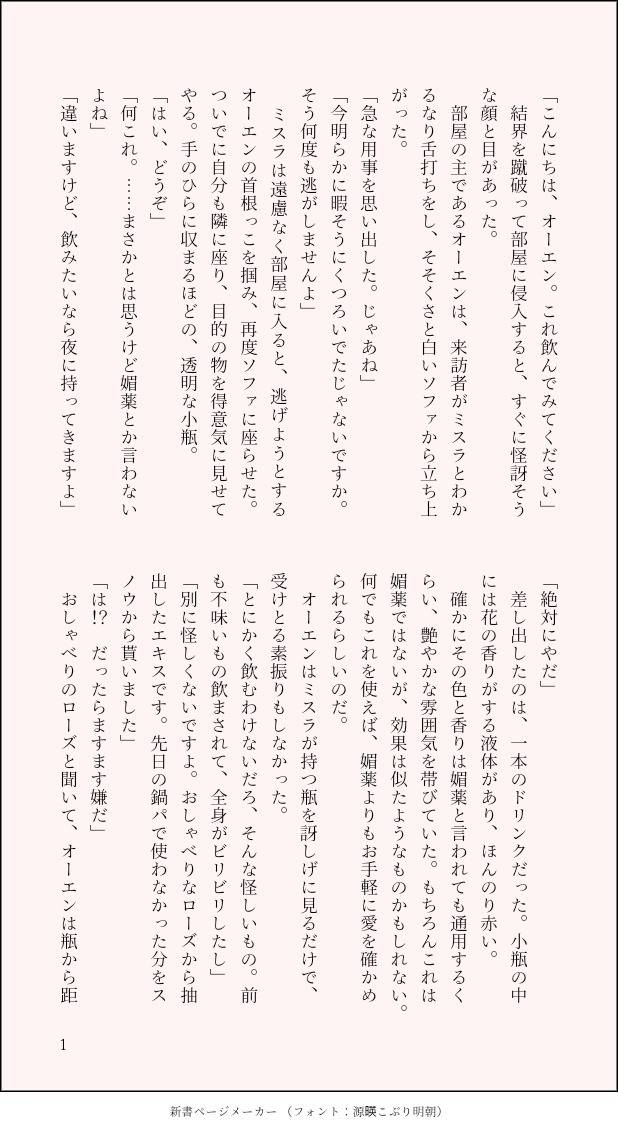 calme☆quiet followDONEおしゃべりなローズ/ミスオエ show all(+4 images) Tap to full screen (size:618x1132).Repost is prohibited Let's send reactions! freqpopularsnackothersPayment processing Replies from the creator Follow creator you care about!☆quiet follow calmeDOODLE竜の花嫁/カキゼイファンタジー世界観あるあるの、謎の婚姻儀式大好きマン 4 calmeDOODLEチャレ!31の無配と同世界線のカキゼイ小話。捏造いっぱい。えっちなのアリ。18歳以上ですか?(y/n) 7160 calmeDONE爽快サイクリング/カキゼイ⚠️拙作同人誌「Relight」の設定のカキゼイ5/22はサイクリングの日らしいので久しぶりにテキーラも使ったあっちゃこっちゃしっちゃかめっちゃか書いてるのがモロバレ激遅執筆テキストライブの記録↓ カットあり倍速がみやすいかとhttps://txtlive.net/lr/1747886865604/s1747906671650 4 calmeDONEカキゼイ/はみがきじょうず 5 calmeDOODLE今年中に出したいカキゼイ新刊の進捗既刊の続きおわんね~~~~~たすけてくれ~~~~載せた場所以外まともに書いてないんじゃぼけ~~~~ 28282 calmeDONEカキゼイ/嘘が好き、嘘つきが好き 4 recommended works ego.DOODLEミスオエワンドロお題:動物 nap_p6TRAINING18歳以上ですか?(y/n)※義が非処女 水野しぶきMOURNING【ミスオエ】ミスオエに対して「何?」ってなりたいだけの話 4 水野しぶきMOURNING【ミスオエ】ミスラとオーエン ※晶視点 12 水野しぶきMOURNING【ミスオエ♀】春の嵐をまとった乙女※学パロ/オーエン先天性女体化 15 水野しぶきMOURNING【ミスオエ♀】青い小鳥オーエン先天性女体化/学パロ時空/オーエンがホテル暮らし 9 mhyk_towDONEオーエン視点。一月のミスオエ新刊のミスオエになるまでの長い道のり。まずはリケから堕とすオーエン。終末教団と司祭様殺し。 10665 水野しぶきDOODLEミスオエ献血しろ 6 水野しぶきDOODLEミスオエ式ドライブスルー 4