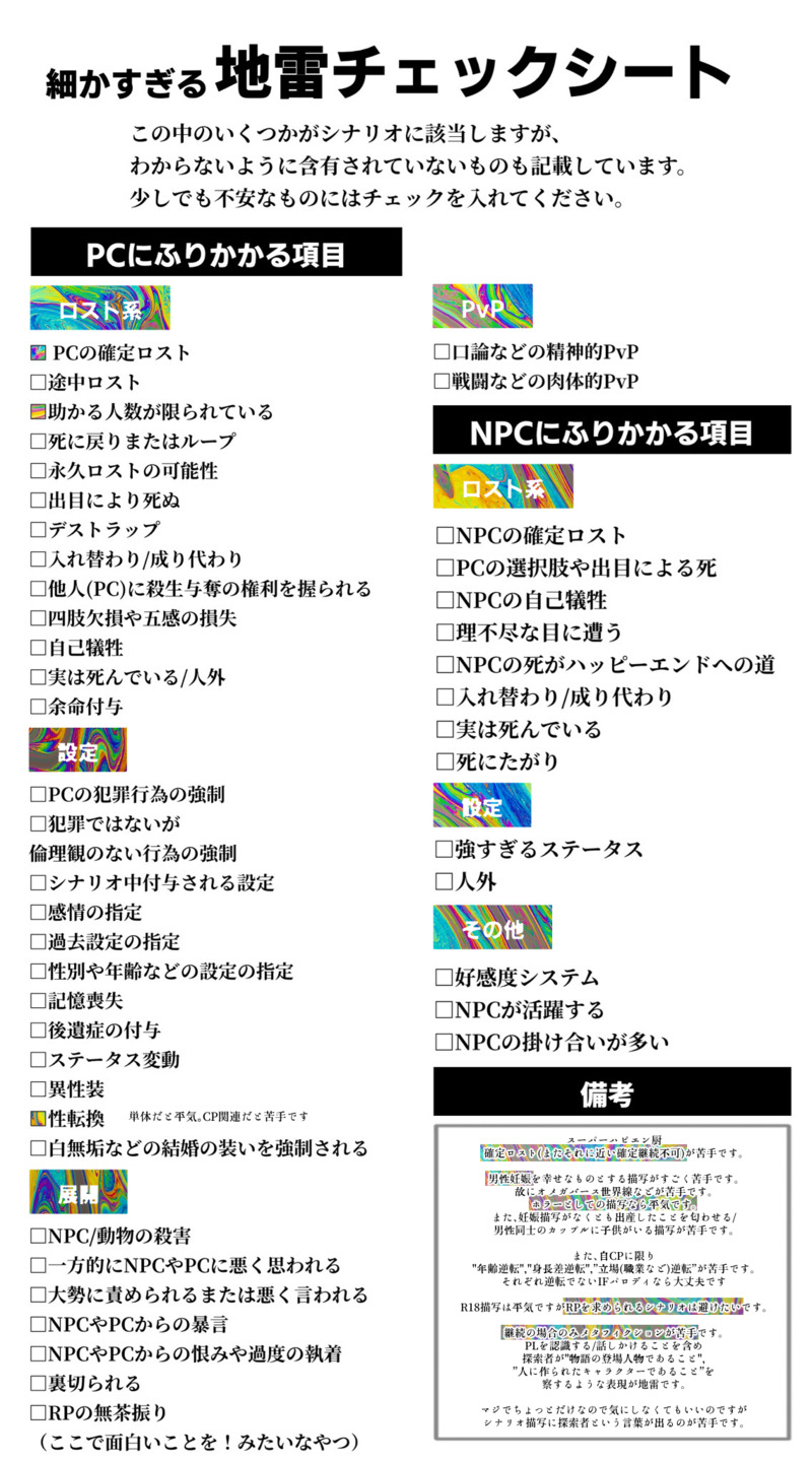 grnnfn☆quiet followMEMO厄介オタクの地雷チェックシート show all(+1 images) Tap to full screen (size:1138x2048).Repost is prohibited Let's send reactions! freqpopularsnackothersPayment processing Replies from the creator Follow creator you care about!☆quiet follow grnnfnSPOILER一応レプリカントの葬列現行未通過✕作り直した部屋 3 grnnfnDOODLE銀曜日現行未通過一応✕嬉しいおもひで達 grnnfnSPOILERホル心現行未通過✕ grnnfnMEMO厄介オタクの地雷チェックシート 2 grnnfnSPOILERレプリカントの葬列 現行未通過× grnnfnMEMO地雷チェックシート 10 recommended works menDOODLEおまけ(槍弓) seri_n1SPOILER伽藍堂書店へようこそ未通過×感想絵&勝手なイメソン#ライ書店へようこそ#絵ライぞ伊波 2 ゆずはPROGRESSファ◯マコラボのやつ nyaaaaan__0302DOODLEくる message_418DOODLEサイレンHO4🆚救世論HO魔性・HP2倍・回避上限70・ダメージ最大10(ただしクリファンによるバフは加算する)・回避クリ→2回攻撃・攻撃クリ→相手回避不可・シルバークローに当たる→次振る回避-10・回避ファン→被ダメ+2等書ききれないルールがあるので分かりづらいがこんな感じでした※シナリオのバレはない ミルキーDONEわんぷり寿命問題のやつ。最終回予想です。 8 enisihonpoDONE上げるの忘れてたやつ十年後、かつて無人島だった場所と真つぐ 941 malcyn7DOODLEマーリンさまに会いにシンドバさんが聖石町に来る話。マリヴァレ 4717 鶯時-おうじ-DOODLEち〇こ押さえてるイサークが描きたかっただけ