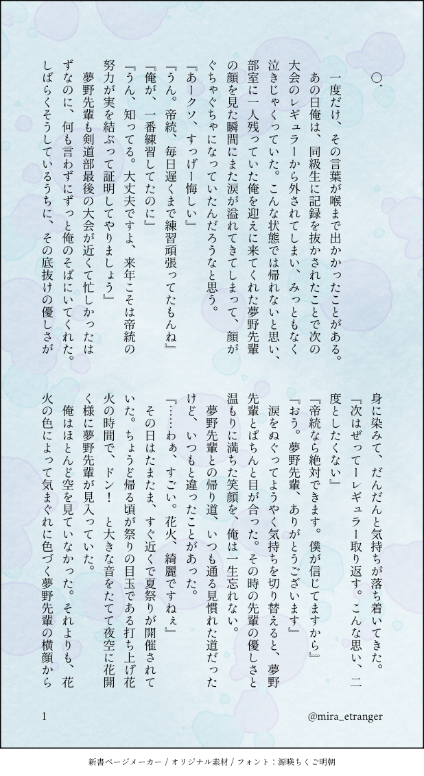 mira_etranger☆quiet followDOODLE陸剣から窓コルになる話を書きたい……!と思って書いてみたものです。高校の時に夢野先輩に告白できなかったことを後悔していた帝統くんと夢野先輩が窓コルになって再会するお話です。一応一区切りはついていますが、そのうち完成させて本にしたいと思っています。3冊目はこれにしようかな……! #帝幻 imperialFantasy #陸剣 landSword #窓コル window-column show all(+19 images) Tap to full screen (size:618x1132).Repost is prohibited Let's send reactions! freqpopularsnackothersPayment processing Replies from the creator Follow creator you care about!☆quiet follow mira_etrangerDOODLE陸剣から窓コルになる話を書きたい……!と思って書いてみたものです。高校の時に夢野先輩に告白できなかったことを後悔していた帝統くんと夢野先輩が窓コルになって再会するお話です。一応一区切りはついていますが、そのうち完成させて本にしたいと思っています。3冊目はこれにしようかな……! 20 mira_etrangerDOODLE鍵垢に載せたものです。放課後の屋上でヤッてるだけの陸剣です。放課後なのに部活してないことには目を瞑ってください…すみません…見られてるかも、という想像で興奮する📚っていいな…と思って書きたいところだけ書きました。※♡喘ぎあり、📚がビッチっぽいので注意です 2 mira_etrangerDOODLE鍵垢に載せたものです。お尻で挟む素股が書きたかっただけです… mira_etrangerMAIKING帝幻の潮吹きネタですが、しばらく手付けないと思うので一旦公開します。エロ書き慣れてからちゃんと続き書くかもしれない…… 2 related works GiguePROGRESS窓コルっていいな♪帰りの退勤の電車で一緒になってうとうとしている📚の肩を、そっと自分の方に抱き寄せる🎲が存在するかもしれない世界線(帝幻) 2 mira_etrangerDOODLE陸剣から窓コルになる話を書きたい……!と思って書いてみたものです。高校の時に夢野先輩に告白できなかったことを後悔していた帝統くんと夢野先輩が窓コルになって再会するお話です。一応一区切りはついていますが、そのうち完成させて本にしたいと思っています。3冊目はこれにしようかな……! 20 GiguePROGRESS帝幻、窓コル風味職場の飲み会(座敷)、周りの賑やかな声を聞きながら📚「…疲れたぁ…帰りたいなぁ」🎲「(ポンッ)(…疲れたよなぁ、そろそろ帰りたいよな)」解散後、📚「最初から、貴方と食事に行く予定を作っておけばよかった(プンプン)」🎲「お、じゃあ今から飲み直さねぇか?」翌朝一緒に出勤するところを目撃した社員がいたとかいなかったとか んちゃむらDOODLE|R-18|窓コルオフィスおセッセ(落書き)(3pですが繋がってません)窓射(?)しても窓くんが拭いてくれるから安心だね…パスワード→18↑? 3 maika41DONE帝幻ウィンターフェス2開催おめでとうございます!窓コルの想像がとまず、ついに書いてしまいました。微妙に123のイベントで配布したペーパーの設定の話にしていますが、こちらだけでも大丈夫です!(はずです)夢野兄、一雨さんが最後に少し出てきます。 7343 ばっきーDONE『はやく溶かして』窓コル R18支部にも上げた窓コル転生ものの番外編。二人の初めての夜。素敵な表紙は装丁カフェ様。どうもありがとうございます!18歳以上、高卒済ですか? (Y/N) 12