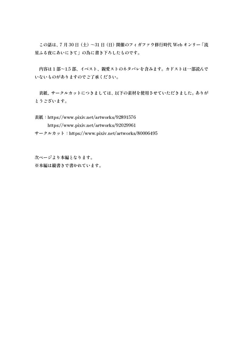 この話は、7月30日(土)~31日(日)開催のフィガファウ修行時代Webオンリー「流星ふる夜にあいにきて」の為に書き下ろしたものです。パスワードは解除しました。