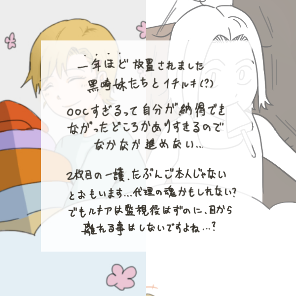 floralok☆quiet followDONEイチルキと黒崎妹たち in 現世の新作(?)です。もやもやどころが多いので長い放置されました。アップ日はなんと始まりましたからちょうど一年!奇跡ですね。正しいより「早く完成しなきゃ…」の気持ちがいっぱいので背景とかポーズとか透視図法とかすべて捏造です。すみませんでした。 show all(+2 images) Tap to full screen (size:600x600).Repost is prohibited Let's send reactions! freqpopularsnackothersPayment processing Replies from the creator Follow creator you care about!☆quiet follow floralokTRAININGP1は(後で描いた)とにかくなんとか着ているお二人(水着風?)。2pは最初から服を考えることを諦めた、意味なしの裸です。スピードを上げるために新しい方法を実戦した。ラクガキしてるときにはいけるかも。PW: 18↑? (Y/N) 2 floralokDOODLEイチャつくお二人が見たくてOOCかも 4 floralokDOODLE鰤で好きな男女カプ5選です。「あまり強い言葉を使うなよ。尊く見えるぞ。」なんてw 2 floralokDOODLE「もう離さないで、」 floralokDOODLEWarfareの二人ならばメっっっっっっチャしてるそうだけど(治安が悪そうPassword: 18↑? (Y/N) floralokDOODLEイチルキ三銃士を連れて来たよ。(元ネタ:ラーメン三銃士)(トレス)