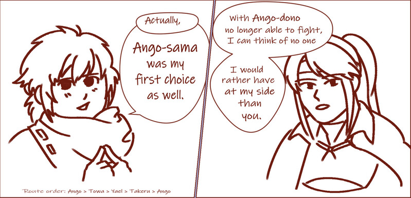 I'm so sorry Takeru, but my heart belongs to...! The other routes felt a little bit like NTR that I had to constantly reload to saves with Ango scenes, haha. My heart is bruised, don't play this