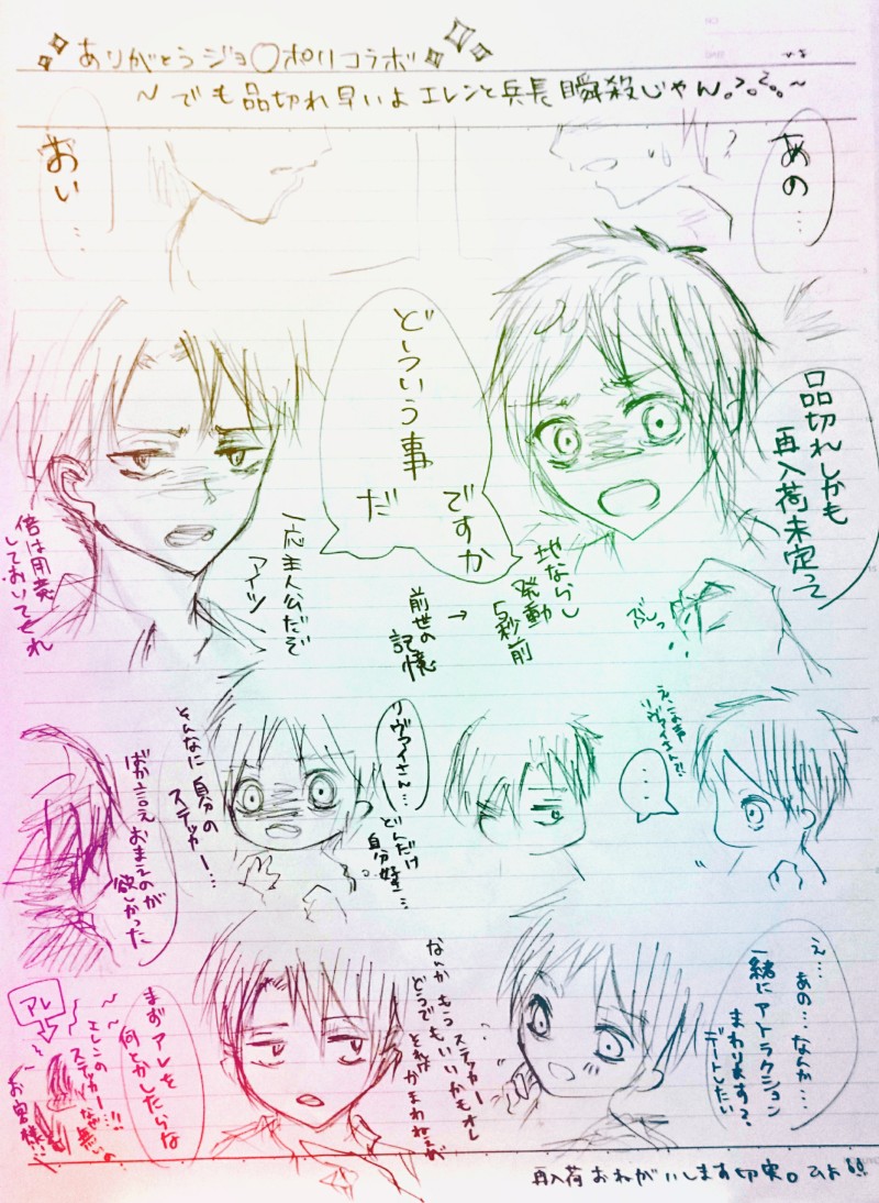 おひよさん☆quiet followDOODLEJ○YP○LISイベント開始直後にエレンと兵長のダイカットステッカー完売でしたねどういう事なの売れて嬉しいですが!😭😂💘💦汚くても嘆きだけ描いておきたかった再販希望!😂意識してなかったけどなんかリヴァエレリ気味ったごめんなさい😂最高に疲れてるんだ Tap to full screen (size:1871x2560).Repost is prohibited Let's send reactions! freqpopularsnackothersPayment processing Replies from the creator Follow creator you care about!☆quiet follow おひよさんDOODLE柱稽古04話のにっこり時透君にやられた記念😊💚 おひよさんDOODLE未だ距離感掴めない研磨な研日かわいい🧡 おひよさんDOODLE研磨~~! おひよさんDOODLEコラボ可愛い!からの宮日!からのせっかくの北さんなのにひどすぎたー!ごめんなさい!なので清書無し!😂 2 おひよさんDOODLE久しぶりのらくがきはリヴァイさんとエレンとミカサでした🧸リヴァイさんの触らない手はミカサちゃんへの配慮です配慮☺️ おひよさんPAST去年秋にらくがきしてたらしい×エレン出てきた。おお、、なんか描きたい。 recommended works qovopPASTattackontitan過去絵ですネタ含みます 2 羅小黒戦記にお熱さん。PROGRESS進撃、リヴァハンちゃん、115話の衝撃。連作の1作目。あとでまとめます。これ、最初にupしたものへの追加はできないのかな?追加させたい… わしんこPROGRESS進撃の巨人、ミカサです!絶妙な表情が難しい泣コピックでこれも、塗っていきます!完成次第アップします(*ˊᵕˋ* ) viviDONE ひこぴこTRAINING本番前にもう1回塗りやっとくか間に合わなくなるからやめとくか…とりあえず簡単に塗れそうなの描いとく。眠い(´ - ω - `) 羅小黒戦記にお熱さん。Reuse Christmas兵長誕生日絵せめて世界の片隅からでもお祝いしたくて……へいちょはぴば。力尽きてごめんなさい。リアクションありがとうございます!ちょこちょこupできるようにがんばります。 ひこぴこSPOILER anju_labTRAINING新装備きた師団長かきいだけのはずが omiotuke_MioDONEツイッターのフォロワーさんおたおめイラストに描いたリヴァイさん。「制服」リクエストだったので、学ラン着せてみました( °∀° )/