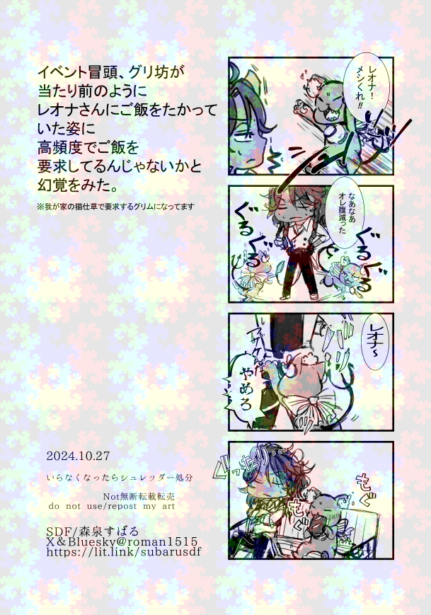 森泉すばる☆quiet followDONEざっくりSNSのログフィルター加工あったりする show all(+14 images) Tap to full screen (size:609x869).Repost is prohibited Let's send reactions! freqpopularsnackothersPayment processing Replies from the creator Follow creator you care about!☆quiet follow 森泉すばるDONEおたおめ!(画像に載せ忘れたケドAIもろもろ無断転載利用NGです) 3 森泉すばるDONE5/4スパコミ用に描いたイラスト2点 2 森泉すばるMENU2025.05.04 東京ビックサイト SUPERCOMIC CITY32に参加します。スペース№東1エ02a SDF 新刊1種 既刊2種を頒布予定です新刊案内触れてもいいですか先輩 A5コンビニコピー本P20 ¥200表紙にトレーシングペーパー使用予定付き合ってないレオ監♀事後通販について当日イベント終了後の在庫次第 6 森泉すばるDOODLE2024年年末年~2025年1月ぐらいに描いてたものすくないですが 4 森泉すばるDONEざっくりSNSのログフィルター加工あったりする 15 森泉すばるTRAINING美術館にて。※自我あり監督生。セリフなし。 4 recommended works かずさ(千戸)DONEトラッポラ嬢。マークスペードにするつもりが、線画まで描き終えて間違えてたことに気付いたので、そのまま続行されたやつ 紺色DOODLE雑魚におこなフロイド Lc_s__DOODLE縁者内きのこたけのこ戦争()結果。今回はたけのこ派の勝利。 まめこあけびDONEキャンディチャレンジというめちゃくちゃえっちで最高な遊びをRTで知ったので、うちのラギ監にもやらせましたちなみに、最初含めてくたくたになるまでちゃんと監は全問正解してますそれを全て「はずれ❤️」「残念❤️」と、見えないのをいいことにちゅっちゅしまくった🍩先輩という謎の設定卑怯者!!!(褒めてる) 4 0_0nisaDONEジェイド、フロイド誕生日おめでと〜〜! yyyyy__uuDONEフロイド、ジェイド誕生日おめでとう🎉🎉🎉君たちに出会えて本当良かった🥳 猫☆丸DONEメタリックフロイド🦈 sui_r_nDONEリリアくん出来上がってました 愛早 さくらDOODLE手癖で描いてみたる〜くとあずず手癖だと際限なく幼くなるんだなぁ〜!あと、容赦なく鼻が上を向く。 2
