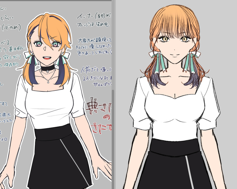 一回目のデザイン時には、典さんの髪がジャキジャキしてるから並べるにあたりこの子も漫画っぽい毛先の方がいいか?と思ってたけど、案外典さんの髪も細かくサラサラに処理できそうなのでサラサラで細かい髪にしてみるなどした!