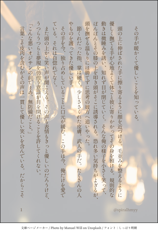 spiralhmyy☆quiet followDONEヘクマン。ヘクの手が好きなマくんのお話。 show all(+1 images) Tap to full screen (size:630x928).Repost is prohibited Let's send reactions! freqpopularsnackothersPayment processing Replies from the creator Follow creator you care about!☆quiet follow spiralhmyyDONE扇さんへのお誕生日祝いBARトロヘクマン、以前上げた話の後日談。始まりの話 6 spiralhmyyTRAINING診断メーカーのお題から。ヘクマン。 5 spiralhmyyREHABILI銀竹雨の日のヘクマン。毎日毎日暑くて嫌になっちゃいますね。 3 spiralhmyyREHABILI夏の夜ひた走る理由現パロヘクマン バイクに乗るマを書きたくて欲望のままに進めた文字並べリハビリ中です 3 spiralhmyyTRAINING保育士マに夢を見ている。甘やかしたいヘクのお話のような…ヘクマン…のつもり 9 spiralhmyyDOODLE某お方のオールバックスーツマに滾って書き散らしたヘクマンです。現パロ。 3