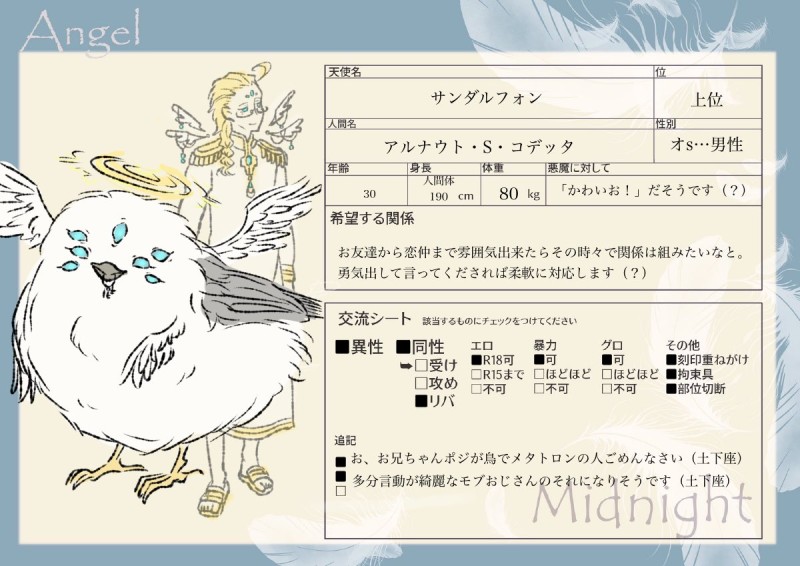 甘草って人のメモ置き場☆quiet followMEMOみっだいより。脳死系でっかいシマエナガ。これでも看守長のはずなんだけど。 #甘草図鑑 licoriceChart show all(+1 images) Tap to full screen (size:1200x849).Repost is prohibited Let's send reactions! freqpopularsnackothersPayment processing Replies from the creator Follow creator you care about!☆quiet follow 甘草って人のメモ置き場SPOILERCoCシナリオ『桃栗三年人面樹七日』。NPCバレ。自作verと原作 ver。 甘草って人のメモ置き場DOODLEルーベルス逆バニー未通過さんでも特に問題ないバージョン。この露出度、なんか変… 甘草って人のメモ置き場DOODLE虹彩ほよん逆バニー。どうしてだろう逆バニーの方が露出低い。どうして?ご配慮されていますが念のため伏せ。 甘草って人のメモ置き場SPOILERouroboros NPCバレにつきワンクッションの開始前一幕 甘草って人のメモ置き場DOODLEある室の博士ちょっとピックアップ。念のためげんみ× 甘草って人のメモ置き場Deep Desire椿リンカ様の夢小説に新年早々脳みそ焼き切れました絵。夢っ子捏造失礼しますありがとうございました…m(_ _)m related works 甘草って人のメモ置き場MEMOあんぴぷ、わんぴぷより。チンピラゴボーズのひげ。ちんちn未使用のヤンキーそのいち。 2 甘草って人のメモ置き場MEMOわんぴぷより。闇属性のヤンデレ系男子。水面下でなんかしてるけど透視したくない。 3 甘草って人のメモ置き場MEMOアブノーマネージカンパニーより。ソシャゲ廃人のエージェントさん。ハゲ子。ぎり人間は卒業してない。 甘草って人のメモ置き場MEMOわんぴぷより。髭を取るとボブになる施設長。カリスマただよう踊るインド人。 2 甘草って人のメモ置き場MEMOアブノーマネージカンパニー、かもうぞかもかより。我が家のマスコット的小鬼。毛の生えたひよ子饅頭。かもうぞの雛。かもかもうぞ。 3 甘草って人のメモ置き場MEMOわんぴぷより。幸の薄いくそざこ事務員。吐き芸。いらん誤解を大量に背負っている。 2 甘草って人のメモ置き場MEMOマルシカサより。訳あって遊園地に配属された暗殺ロボ。めーめーさんは言葉を綺麗にする妖精さん。 2 甘草って人のメモ置き場MEMOアブノーマネージカンパニーより。創作企画っ子長男のくらげ 。崇めよ。ぬらりひょんモチーフの創作アブノーマリティです。 甘草って人のメモ置き場MEMOあんぴぷ、わんぴぷより。わひゃの人。ぱいなぽヘアーのくそざこエージェント。手癖で描きやすい元気なナビ子ちゃん。 3 recommended works 甘草って人のメモ置き場MEMOアブノーマネージカンパニーより。創作企画っ子長男のくらげ 。崇めよ。ぬらりひょんモチーフの創作アブノーマリティです。 甘草って人のメモ置き場MEMOアブノーマネージカンパニー、かもうぞかもかより。我が家のマスコット的小鬼。毛の生えたひよ子饅頭。かもうぞの雛。かもかもうぞ。 3 甘草って人のメモ置き場MEMOあんぴぷより。大道芸人のちょっとえっちなおねえさん。華やかなようで純度100%の田舎娘。 甘草って人のメモ置き場MEMOあんぴぷより。危険なエリンギの化け物。ぎるねり! 3 甘草って人のメモ置き場MEMOあんぴぷ、わんぴぷより。チンピラゴボーズのデブ。ちんちn未使用のヤンキーその2。 2 甘草って人のメモ置き場MEMOあんぴぷより。ペンギンハーピーのお嬢さん。お名前はバットマンのヴィランを演じた方から。 2 甘草って人のメモ置き場MEMOわんぴぷより。本名双葉リオ。無事におうちに帰れた骸骨。弟ルイとの記念写真も。 3 甘草って人のメモ置き場MEMOわんぴぷより。幸の薄い哀れな木偶の坊。こいつもいらん誤解で楽しいことになっている。 2 甘草って人のメモ置き場MEMOわんぴぷより。妖艶なようですっぽこちゃいにず。蜘蛛の人外ジャックと一緒。
