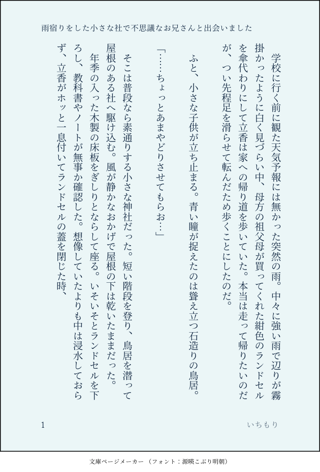 chimo☆quiet followDONE雨の日に不思議なお兄さんと出会った小学生立香くんのお話。ぐだロビ未満。このロビンさんは多分人間に擬態した狐の妖だと思われます。 show all(+8 images) Tap to full screen (size:630x928).Repost is prohibited Let's send reactions! freqpopularsnackothersPayment processing Replies from the creator Follow creator you care about!☆quiet follow chimoDOODLE搾り取られる可哀想ないぐくんが見たい chimoPROGRESSもりもりぬりぬり(にょたろび)女体です大丈夫ですか?(yes /no) chimoDOODLE新刊で描く子持ちフッド♀ chimoPROGRESS遠近がわからないなりに描けてると思う。ぐだロビ寄稿原稿進捗。 chimoDONEぐくんを悦ばせたくてダークメイドバニーになったフッド。R-18 chimoDOODLEビキニバニーフッド recommended works まな丑PROGRESSエア新刊表紙 maru00kichiPROGRESS「焼肉屋に行った帰りという色気もへったくれもないシチュエーションで劣情を抱く攻め」というニッチな性癖を拗らせたので自己生産ちう。珍しく一人称視点。ナチュラルに同棲してるよ。 4 Bluemoon0706PROGRESS人魚の日にあげたイラストを元に作ったSSです人魚のぐだロビのお話です続きはまた書きたいな・・・ 4 maru00kichiDOODLEデア時空/ぐだロビ/二人で活動中にエネミーに襲われたとかなんかそんな感じ額にキスする描写が書きたかっただけなのにどうしてこうなったのか(頭抱え)尻切れトンボ注意〜。 2 maru00kichiDOODLE現パロ時空/ぐだロビ/謎の同棲時空硬いお肉も炭酸に漬けるととっても柔らかくなるんですっていうお話。ぐ君が旅行から帰ってくる日にいそいそと準備してるロ。くたくたに柔らかくなって食べ頃になってるのは豚肉だけじゃないですよ。※当社比で糖度高め。ぐだ男=藤丸立香表記 3 maru00kichiDONE現パロ/ぐだロビ/突然の雪と帰宅シチュフォロワーさんの呟いてた「寒い日の帰宅シチュと推しCP」に便乗した即興SS。寒いとそれだけでささくれだった気分になるけど、暖かいものと温めてくれる誰かがいれば、寒さだって乙なものって思えるかもしれませんね。 3 yuukiryo_drDONELB6の活性アンプルで思ったやつ。(設定は妄想だけど)簡単に使わせるカルデア、怖い。 2 maru00kichiDOODLEデア時空/ぐだロビ/自己肯定感の落ちたロをぐ君が宥めてるだけサイコーなネタ(https://twitter.com/nago_nago_nagon/status/1430216224194007044?s=20)を見つけてしまったので書きました。ギャグだよ。 3 翠蛙尸棺DOODLEkakuhidan post 角飛 2