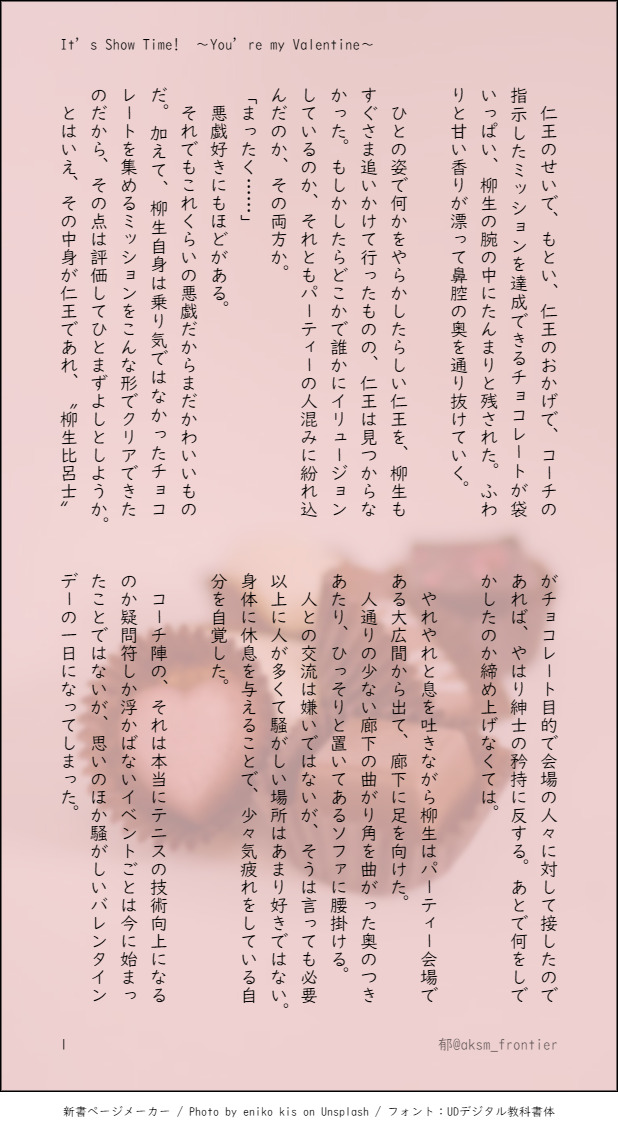 アキシマ☆quiet followDONE【82】It's Show Time! ~You're my Valentine~🎾🐰くんValentine missionイベスト8話の後の82。 show all(+11 images) Tap to full screen (size:618x1132).Repost is prohibited Let's send reactions! freqpopularsnackothersPayment processing Replies from the creator Follow creator you care about!☆quiet follow アキシマArtSummary202282日記(下書き)2022年1月に書いていたもの。文章力向上のため、毎日何かしら書こう→そうだ、8と2の日記を毎日書こう、これなら時間もかからないだろうし!…とワンドロ感覚で裏アカで連載をはじめました。リアル1月7日に82の1月7日(始業式)スタート、卒業式までの3か月弱を綴り、完結したらまとめて支部に載せよう…という企画でしたが、1月半ばで早々に挫折しました(;・∀・)アチャー 13577 アキシマDONE秋の帰り道2022.10.28 3 アキシマTRAININGFAKE卒業までの3か月、偽りの恋人同士を演じるD1の話。「好きな方が出来たら言ってください」 2880 アキシマPROGRESS僕の秘密の恋人~恋するウサギちゃん~ 7501 アキシマDONE僕の秘密の恋人~さあ行け、あなたは私の王子様~仁王くん推しの柳生さんが仁王くんと自分たちの出演した映画を観に行く話。シリーズ4話目としていた途中まで書いてたものの、せっかくリョ!公開1周年なので2,3話を飛ばしてこちらを先に仕上げてみた。※2022.9.3 8164 アキシマDONE僕の秘密の恋人~仁王くん最推しの柳生さんの話~副題そのまんまの話。柳生さんのキャラ崩壊注意。現実と同じように🎾👑メンバーのグッズやゲームが発売されているメタを含んだギャグ。仁王くんは柳生さんに片想い中。そして柳生さんは……?※2022.8.14 7939 recommended works guaGxyDOODLE 2 uryumikoDOODLEドーイ詰め詰め おわりDOODLE現パロオトスバ ⚠️死ネタ含忘れたままでも 2 turukame3914DOODLE実くんがホサのサイズ感に悩む話。全部で3ページ。何でも許せる人向け。パスワードはいつもの(成人済yes/no) 3 Kururumiryi_39TRAINING四季送り 「今」が書きたくて書きました春と秋⚠️全部雰囲気以上のネタバレらしいものは無いけど、気になる人は見ないのを勧める自分で解釈違いで憤死しないために、常に場面に二人いるけど一切相手の台詞を使わない書き方の練習をしました。単調になるけど、単純な一人称視点以上に一方的な感じが出て悪くなかったです何となく描いたので一枚目はそこまで関係ないです 5 固めのカルメ焼きSPOILER #牛どりこげぬ ネタバレめちゃくちゃよかったです〜!!! 3 しらたまDONEXで素敵なSSを書かれていたのでイメージイラストを押し付けました…!巫女さんverフリーレンさま慣れない塗り方で難産でしたが、普段描かない装飾品が楽しかった〜! れい。2DOODLE ぱおんぬDOODLEリクエストありがとうございました!!!WEBオンリー中にいただいたリクエストはこちらのページにまとまっております色々な絵が描けて本当に楽しかったです〜!!!#英星献_after 6