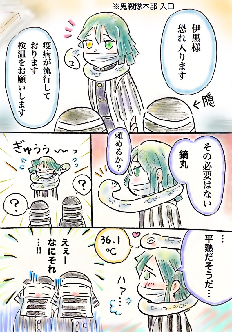 「鏑丸にとぐろ巻きされて至福の伊黒さん」