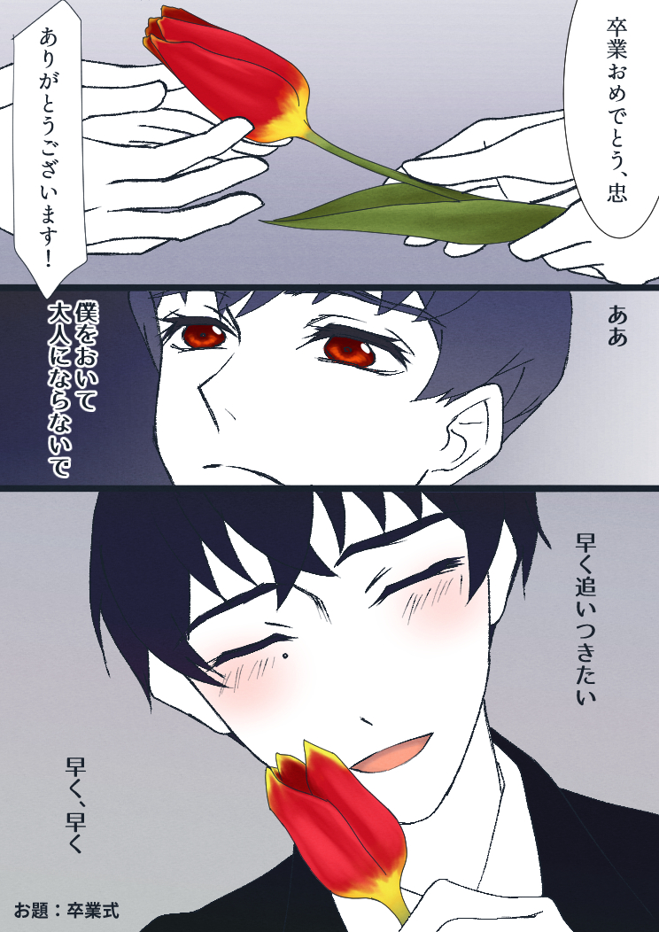 catfish__red☆quiet followMOURNINGワンドロ:卒業式 で描いたやつ供養。自分の思い出を振り返ると小学生にとって中学生ってとんでもなく大人に見えて、遠くに行っちゃうような気がしたなぁ〜と、愛様(10)もそんな寂しさや置いていかれる焦りみたいなものを感じたんではないかと。と、赤いチューリップの花言葉は「愛の告白」だったり、説明しないと伝わらないなぁこれ……って思ってそっとしてました。難しい、漫画難しい。 Tap to full screen (size:744x1052).Repost is prohibited catfish__redDONEとある朝(朝?)の出来事🌹様と鞭の組み合わせは反則過ぎるでしょう(歓喜) catfish__redDOODLE眼鏡忠を描きたくなった catfish__redSPOILER※2枚目OVAネタバレ絵ですとあるシーンのお顔が描きたかったのと、とあるチラ見えパーツの話がしたかったという、ちょっとした落書きです記憶のままに描いてるので細かいところは違ってるかも 2 catfish__redSPOILER※2枚目OVAネタバレ絵ですMorning Routine愛忠の手加減のなさにずっと腰抜かしてる人間の落書き早く円盤をください 2 catfish__redDONEハッピーハロウィン🎃愛忠🦇🐺 catfish__redDONE🦋にあげた🐱愛忠をこっちにも背景が思いつかない recommended works pagupagu14DONE僕の幸せの青い鳥 愛忠#春の愛忠fes2021愛忠が喧嘩をしてビーフをする話です。一応これも童話を絡めてるとので愛忠FES用として上げます 2383 めりつさ壁殴りDONEオンリー開催おめでとうございます!愛忠マンガ4Pと+α(没のネップリイラスト)などです※冒頭暦とランガがイチャつくよ!(作者はぬるめ暦ラン派) 8 辺境の沼地のゆりあDONE猫の国のやつ UncannyVioletDONE🌹 🎉 Happy Birthday to Ainosuke~! 🌹 🎉 I hope you‘ll have a wonderful birthday 🎂 🎉 #神道愛之介誕生祭2022 #愛忠 #忠愛 #tadaai #aitada#忠愛lovelyweek UncannyVioletDOODLEShikigami/Yokai AU??? 🤷♀️Context:https://twitter.com/UncannyViolet/status/1519528942247550981?s=20&t=6yjBrsEP4FlNj-q7QUfsow UncannyVioletDONECompleted illustration for the TadaAi Big Bang event on Twitter~! If you'd like to read their story: https://archiveofourown.org/works/39223779/chapters/98141736It was so much fun to work on this <3 小SylvieDOODLE火焰戎装番外 7 LemonPigeonHEYDOODLE校郁+推罗,4p但纯爱 AkasiyukinaSPOILERサイレン自陣水月のはなしメイドは冥土のお洋服現行未通過×サイレンも。 377