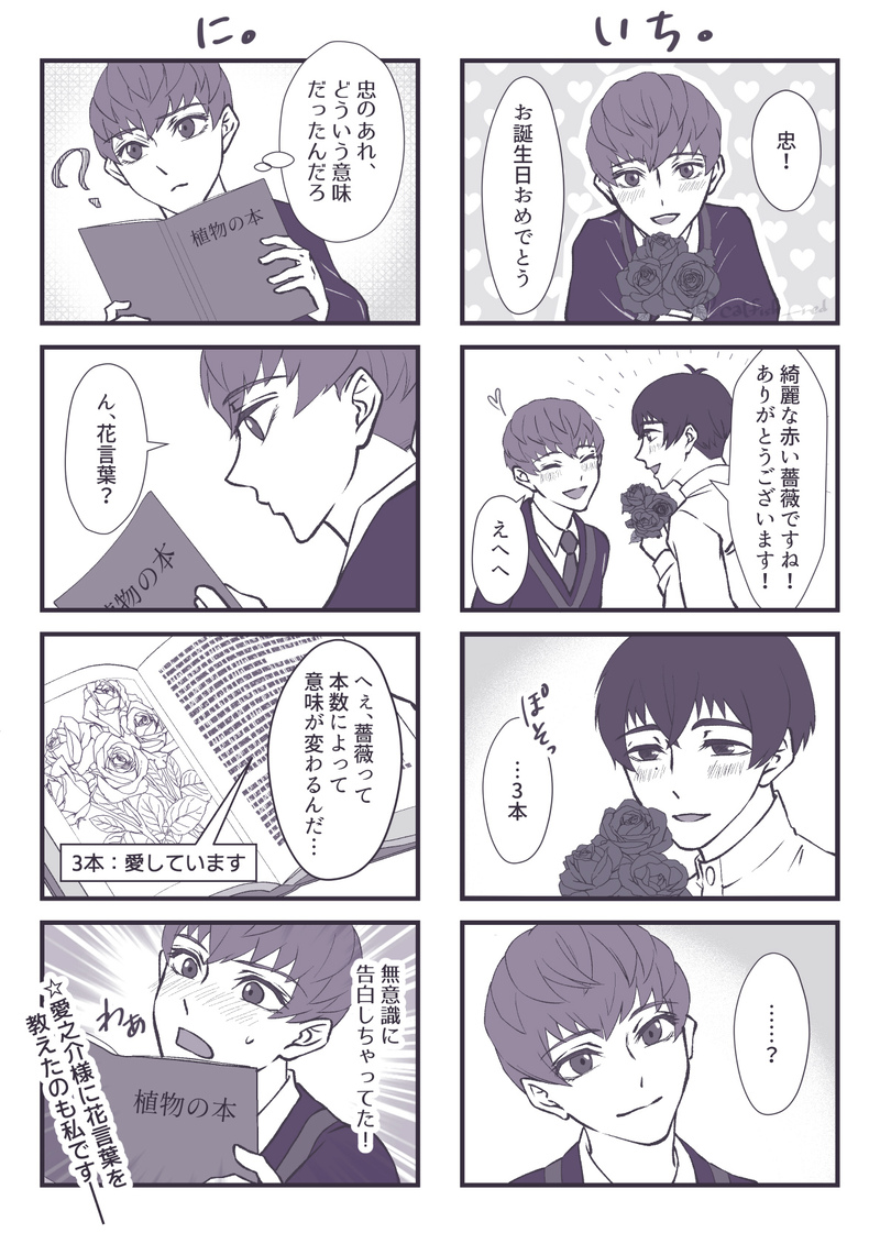 catfish__red☆quiet followDONE主従WEBオンリー『Paso doble del destino!!』パソデス1122にて公開した四コマ漫画です。愛之介様といえば薔薇。そして幼い頃から薔薇に囲まれ、想い出は薔薇とともに…な愛忠ですが、11月22日の誕生花が「白い薔薇」と知ってどっしぇ~~~~ってなった勢いで描いた薔薇に関するお話です。生まれながらに愛之介様を象徴する花を背負ってるんですね、忠。運命つよい。 #愛忠 aizhong show all(+1 images) Tap to full screen (size:1188x1680).Repost is prohibited catfish__redDONEとある朝(朝?)の出来事🌹様と鞭の組み合わせは反則過ぎるでしょう(歓喜) catfish__redDOODLE眼鏡忠を描きたくなった catfish__redSPOILER※2枚目OVAネタバレ絵ですとあるシーンのお顔が描きたかったのと、とあるチラ見えパーツの話がしたかったという、ちょっとした落書きです記憶のままに描いてるので細かいところは違ってるかも 2 catfish__redSPOILER※2枚目OVAネタバレ絵ですMorning Routine愛忠の手加減のなさにずっと腰抜かしてる人間の落書き早く円盤をください 2 catfish__redDONEハッピーハロウィン🎃愛忠🦇🐺 catfish__redDONE🦋にあげた🐱愛忠をこっちにも背景が思いつかない related works でかい肉が食べたいDONEスケベの愛忠🌹🐶 catfish__redDONE愛忠ワンドロお題:お風呂シャンプーしながらお互いの髪型の真似っ子してる2人…なんだけど伝わりにくいかも…とにかくイチャついてる2人が見たかったです!合計4時間くらい pagupagu14DONEchocolate Kiss/愛忠幼少期の愛忠→最終回後くっついてる愛忠のVDの話。季節外れですが思いついたので。ネタは鮮度が大事!忠視点は脳内セリフが煩くしやすくていかに愛之介様を好きか書けるから楽しいねchocolate Kiss 愛忠 「忠、それ何食べているの?」水の入っていないプールの傍で甘ったるそうな匂いをさせているものを食べている忠に声を掛けると嬉しそうな顔で僕の名を呼ぶ忠。僕はその顔が一等好きだった。「チョコレート菓子ですよ」「チョコレート…」「ええ。今日はバレンタインデーなので本命のついでだとは思うのですが、皆さんよくくれるんですよ」忠はそう言っているが僕は知っていた。明らかにそのチョコレート菓子の山の中に明らかな本命が混じっていることを。この量のチョコレート菓子は普通ではまずもらうことのない量だと言うことを。救いなのは当の本人である忠がその気持ちに気づいていないということだった。「あ、愛之介様も食べますか?」「え、僕…?」「はい。手作りとかはさすがに食べさせられないんですがこういう市販のものとかなら…」「…いい、いらない」「そうですか?わかりました」不思議そうな顔をしてお菓子を食べるのを再開させる忠の袖を摘まむ。「愛之介様?」「なんか…それ、やだな…僕」「ええっと…嫌、とは?」「忠が…誰かにもらったお菓子食べてるの嫌だ…」特に今日もら 2807 pagupagu14DONEあなたの犬ですが?/愛忠頭のネジがぶっとんだ忠が書きたかったのでゾンビ蔓延る世界で忠が運転する車で逃げる愛忠+ジョー+チェリーです。愛忠要素は限りなく0に近いですが書いてる私が愛忠オタクなので愛忠です。言うて若干愛忠ですが。従者が銃器ぶっぱなして平然として若干引かれてるのが好きなんだよな~~~~~性癖ですあなたの犬ですが? 愛忠 「愛之介様、舌を嚙まないように気をつけてください。後、どこか捕まっていてくださいシートベルトもしっかりと」「た、忠…?」冷静な秘書の言葉に動揺を隠せない愛之介。それは後部座席にいる虎次郎と薫も同じことだった。しかし、走る車の後ろからゆっくりとした速度ではあるが大量のゾンビが追ってきている。逃げ場がないことは重々承知だった。「――振り切ります」忠、と呼ぼうとした声は忠が懐から取り出したものの重大さによって引っ込んでしまう。窓を開けると忠は口で栓を抜き、手榴弾を後ろへと投げた。すると車の後ろからは大きな爆風と苦しむようなゾンビの声が。えっ、ええっ!!??と、慌てふためく虎次郎の声などお構いなしだった。乱暴な運転。普段からは想像がつかないながらも愛之介の隣の忠は顔色一つ変えていなかった。「た、忠!横!」「?…ああ」運転席の方にへばりついてくるゾンビを見て忠は恐ろしいほどに表情一つ変えなかった。空いた窓から顔を覗かせるゾンビの口内に銃を手にした忠は見向きをしないままドスン、ドスンと撃っていく。ァガ……と気味の悪い声を上げながら沈んでいくゾンビに 1163 siTRAINING愛しい忠実な犬❤️ pagupagu14DONE蛇の誘惑/愛忠暦をダシにイチャつく愛忠。ヤキモチを妬く愛之介様のお話です。強かな受けが好き蛇の誘惑 愛忠 愛之介用の軽食は忠お手製のサンドイッチでSの後に食べてもらうことにしよう。当の本人はスノーとのビーフに夢中だし、と言うわけで忠は一人その光景を見つめながらファーストフード店とハンバーガーに齧り付いていた。たまに、こう言った安っぽい味が無性に食べたくなるのだ。こう言う価値観はきっと愛之介に理解されないと知っているからこうやっ