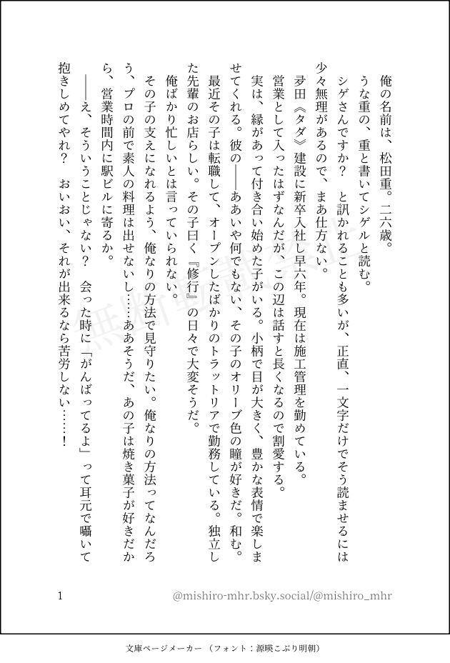 mishiro_mhr☆こそフォロ自主練重満の独白。文章の練習で、書いてみました。文庫ページメーカー様テンプレお借りしています。 すべて表示(+1枚) タップで全画面(原寸:630x928)無断転載禁止 リアクションをたくさん送って応援しよう! よく使う人気おやつその他支払処理中 作者からのリプライ 気になる人をどんどんフォローしよう!☆こそフォロ mishiro_mhr自主練重満の独白。文章の練習で、書いてみました。文庫ページメーカー様テンプレお借りしています。 2 mishiro_mhrメモ #同人誌振り返りレポートテンプレをお借りして本編1、2巻を振り返りました。※2巻の制作期間ですが半年はサバ読みすぎました。仕事に追われ何ヶ月か休んでたので休止期間含め8ヶ月ぐらいです。 2 mishiro_mhrお知らせ2025年描き納め。2巻書き下ろしネタですが、満は転職後の制服になっています。(購入いただいた方、有難うございました!) mishiro_mhrできた自論7開催に合わせて夏をテーマに4コマ漫画2つupしました。あまり数描けず申し訳ないです。。読んでくださった方、ありがとうございます!! mishiro_mhr作業進捗5話ネーム(ラフ+セリフ入れ)ケツ叩きのため公開します、汚くてすみませんリアクション頂けたら大変励みになります!!!!! 16 mishiro_mhr作業進捗【関係性自論6 限定公開】Mild full body 4話途中パスワードはshigemichi ※未完成のため後半ほぼラフのままです。セリフ抜け等あり読みづらい箇所あります【あらすじ】バルの店員の満(みちる)の将来について相談を受けていた客の重(しげる)。その夜居酒屋で夕飯を食べていたが満が酔いつぶれてしまう。介抱した翌日、お詫びにとバイト先で学んだナポリタンを振るまう約束をする。 11