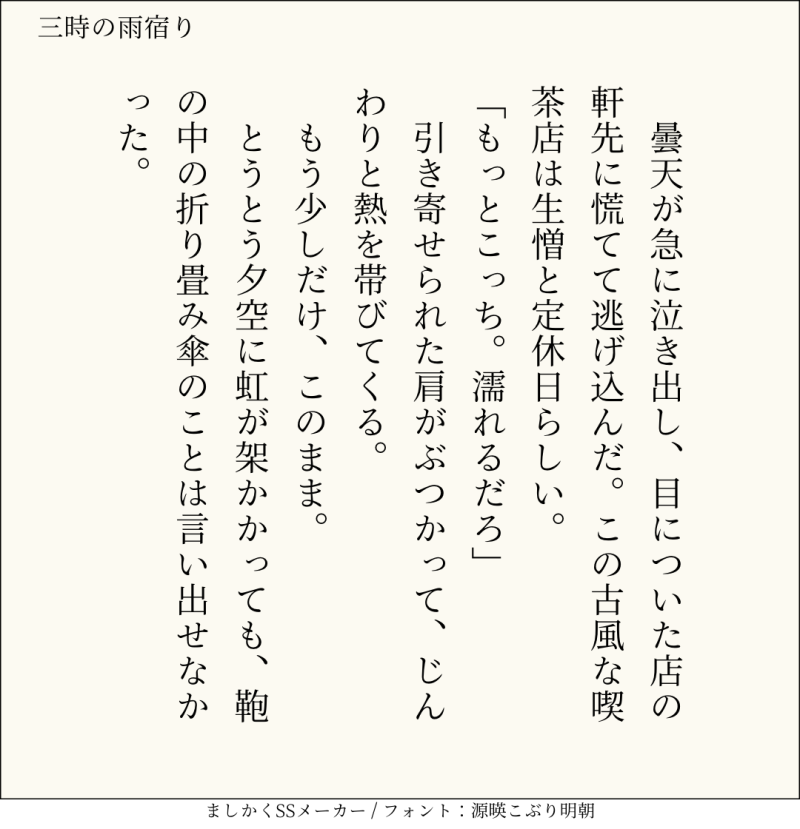 句読点込みで140文字ぴったりに仕上げるのがマイルール。140文字で書くお題ったー(shindanmaker.com/375517)で書いたSS等、短文置き場