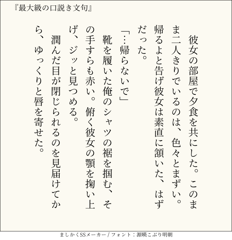 句読点込みで140文字ぴったりに仕上げるのがマイルール。140文字で書くお題ったー(shindanmaker.com/375517)で書いたSS等、短文置き場