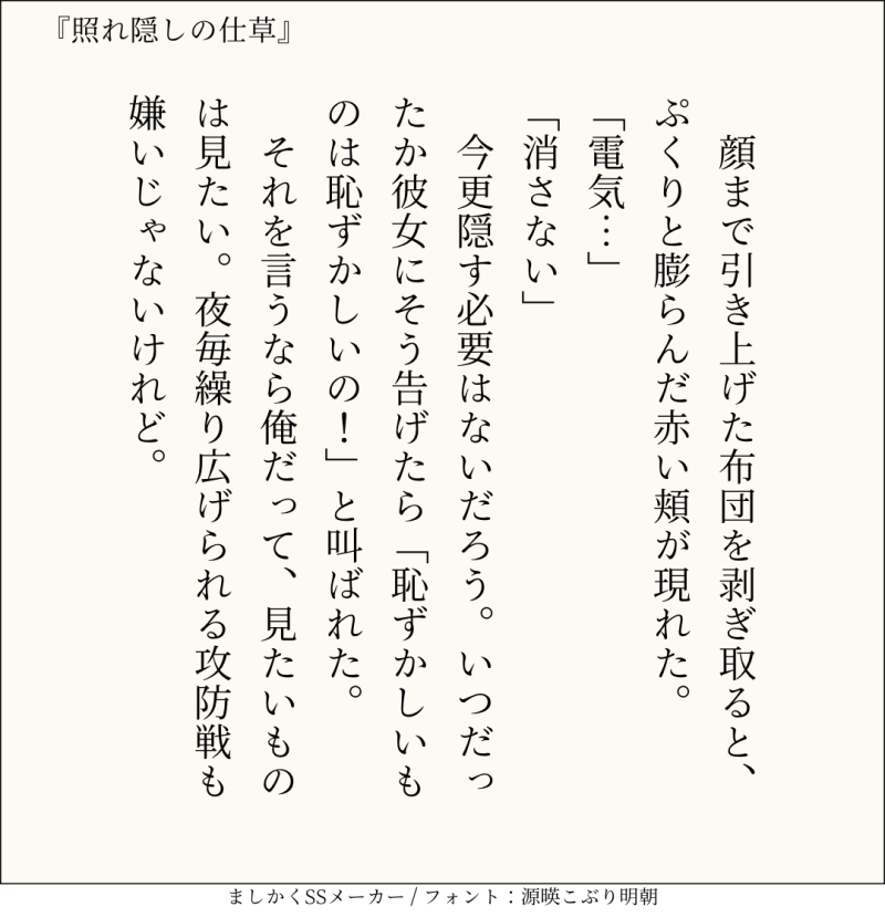 句読点込みで140文字ぴったりに仕上げるのがマイルール。140文字で書くお題ったー(shindanmaker.com/375517)で書いたSS等、短文置き場