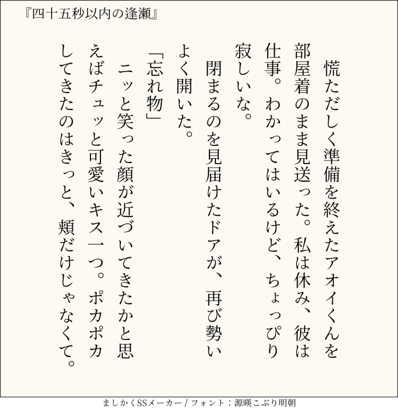 貴方はアオ相で『四十五秒以内の逢瀬』をお題にして140文字SSを書いてください。