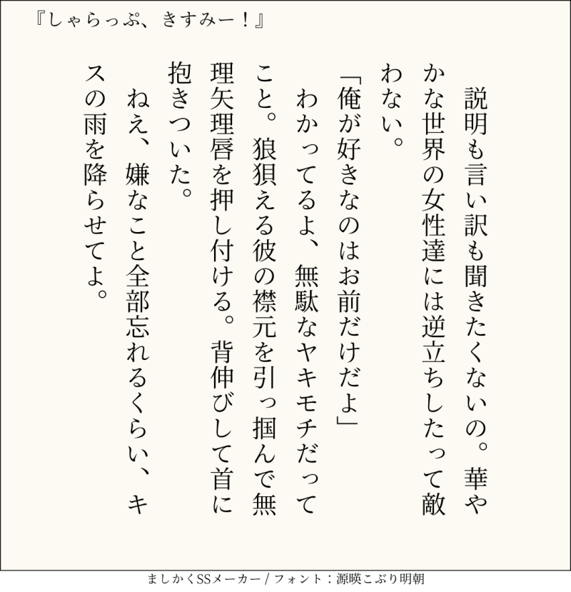 句読点込みで140文字ぴったりに仕上げるのがマイルール。140文字で書くお題ったー(shindanmaker.com/375517)で書いたSS等、短文置き場